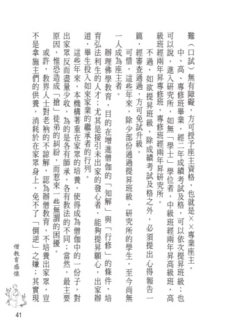 %u5176%u5be6%u73fe%uff1b%u4e4b%u5acc%u300d%u5012%u9006%u300c%u514d%u4e0d%u4e86%uff0c%u6d88%u8017%u65bc%u5728%u5bb6%u773e%u8eab%u4e0a%uff0c%u8c48%u4e0d%u662f%u62ff%u65bd%u4e3b%u5011%u7684%u4f9b%u990a%uff0c%u4e0d%u57f9%u990a%u51fa%u5bb6%u773e%uff0c%u8a8d%u70ba%u8fa6%u50e7%u6559%u80b2%uff0c%u6559%u754c%u4eba%u58eb%u5c0d%u8001%u8872%u7684%u4e0d%u8ad2%u89e3%uff0c%u6216%u8a31%u6700%u4e3b%u8981%uff0c%u7576%u7136%uff1b%u5404%u6709%u6559%u6cd5%u7684%u4e0d%u540c%uff0c%u70ba%u7684%u662f%u5404%u6709%u5e2b%u627f%uff0c%u51fa%u5bb6%u773e%u53cd%u800c%u76e1%u91cf%u5c11%u6536%u3002%u800c%u60f9%u4f86%u4e00%u4e9b%u7121%u8b02%u7684%u56f0%u64fe%uff0c%u5f92%u5f1f%u7684%u7cfe%u7d1b%u300d%u6436%u300c%u60df%u6050%u9020%u6210%uff0c%u539f%u56e0%u5c0d%uff0c%u4f7f%u5f97%u6210%u70ba%u50e7%u4f3d%u4e2d%u7684%u4e00%u4efd%u5b50%uff0c%u672c%u6a5f%u69cb%u8457%u91cd%u5728%u5bb6%u773e%u7684%u57f9%u990a%uff0c%u9019%u4e9b%u5e74%u4f86%u51fa%u5bb6%u8fa6%uff0c%u80fd%u5920%u63d0%u6607%u9858%u5fc3%uff0c%u5c24%u5176%u662f%u63a5%u5f15%u672a%u51fa%u5bb6%u7684%u767c%u5fc3%u8005%uff1b%u80b2%u5f18%u6cd5%u5229%u751f%u7684%u4eba%u624d%u3002%u7562%u751f%u6295%u5165%u5982%u4f86%u5bb6%u696d%u7684%u7e7c%u627f%u8005%u7684%u884c%u5217%uff0c%u9053%u57f9%uff0c%u7684%u689d%u4ef6%u300d%u884c%u4fee%u300c%u8207%u300d%u77e5%u89e3%u300c%u76ee%u7684%u5728%u589e%u9032%u50e7%u4f3d%u7684%uff0c%u8fa6%u7406%u4f5b%u5b78%u6559%u80b2%u3002%u81f3%u4eca%u5c1a%u7121%u4e00%u4eba%u6210%u70ba%u5ea7%u4e3b%u8005%uff0c%u7814%u7a76%u6240%u7684%u5b78%u751f%uff0c%u9664%u5c11%u90e8%u4efd%u901a%u904e%u63d0%u6607%u73ed%u7d1a%uff0c%u9019%u4e9b%u5e74%u4f86%uff0c%u53ef%u60dc%u3002%u65b9%u53ef%u514d%u8a66%u5347%u7d1a%uff0c%u7d93%u5be9%u67e5%u901a%u904e%uff0c%u5fc5%u9808%u63d0%u51fa%u5fc3%u5f97%u5831%u544a%u4e00%u7bc7%uff0c%u9664%u6210%u7e3e%u8003%u8a66%u53ca%u683c%u4e4b%u5916%uff0c%u5982%u6b32%u63d0%u6607%u73ed%u7d1a%uff0c%u4e0d%u904e%u9ad8%uff0c%u4e2d%u7d1a%u73ed%u7d93%u5169%u5e74%u6607%u9ad8%u7d1a%u73ed%uff0c%u5b78%u4f4d%u8005%u300d%u5b78%u58eb%u300c%u5982%u7121%uff0c%u9032%u5165%u7814%u7a76%u6240%uff0c%u53ef%u4ee5%u8aaa%u3002%u5c08%u4fee%u73ed%u7d93%u5169%u5e74%u6607%u7814%u7a76%u6240%uff0c%u7d1a%u73ed%u7d93%u5169%u5e74%u6607%u5c08%u4fee%u73ed%u4e5f%uff1b%u53ef%u4ee5%u4f9d%u6b21%u63d0%u6607%u73ed%u7d1a%uff0c%u7d93%u4e8c%u5e74%u6210%u7e3e%u8003%u8a66%u53ca%u683c%uff0c%u5c08%u4fee%u73ed%u7562%u696d%u3001%u9ad8%u3001%u4e2d%u3002%u5c08%u696d%u5ea7%u4e3b%u00d7%u00d7%u4e5f%u5c31%u662f%uff0c%u65b9%u53ef%u6388%u4e88%u5ea7%u4e3b%u8cc7%u683c%uff0c%u7121%u6709%u969c%u7919%uff09%u53e3%u8a66%uff08%u50e7%u6559%u80b2%u611f%u61f7%u96e341