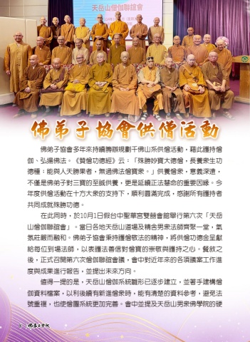 %u3000%u3000%u4f5b%u5f1f%u5b50%u5354%u6703%u591a%u5e74%u4f86%u6301%u7e8c%u7c4c%u8fa6%u898f%u5283%u5343%u4f5b%u5c71%u7cfb%u4f9b%u50e7%u6d3b%u52d5%uff0c%u85c9%u6b64%u8b77%u6301%u50e7%u4f3d%u3001%u5f18%u63da%u4f5b%u6cd5%u3002%u300a%u8d0a%u50e7%u529f%u5fb7%u7d93%u300b%u4e91%uff1a%u300c%u6b8a%u52dd%u5999%u5bf6%u5927%u5fb7%u50e7%uff0c%u9577%u990a%u773e%u751f%u529f%u5fb7%u7a2e%uff1b%u80fd%u8207%u4eba%u5929%u52dd%u679c%u8005%uff0c%u7121%u904e%u4f5b%u6cd5%u50e7%u5bf6%u773e%u3002%u300d%u4f9b%u990a%u50e7%u773e%uff0c%u610f%u7fa9%u6df1%u9060%uff0c%u4e0d%u50c5%u662f%u4f5b%u5f1f%u5b50%u5c0d%u4e09%u5bf6%u7684%u81f3%u8aa0%u4f9b%u990a%uff0c%u66f4%u662f%u5ef6%u7e8c%u6b63%u6cd5%u6167%u547d%u7684%u91cd%u8981%u56e0%u7de3%u3002%u4eca%u5e74%u5ea6%u4f9b%u50e7%u6d3b%u52d5%u5728%u5341%u65b9%u5927%u773e%u7684%u652f%u6301%u4e0b%uff0c%u9806%u5229%u5713%u6eff%u5b8c%u6210%uff0c%u611f%u8b1d%u6240%u6709%u8b77%u6301%u8005%u5171%u540c%u6210%u5c31%u6b8a%u52dd%u529f%u5fb7%u3002%u3000%u3000%u5728%u6b64%u540c%u6642%uff0c%u65bc10%u67081%u65e5%u5047%u53f0%u4e2d%u8056%u83ef%u5bae%u96d9%u56cd%u6703%u9928%u8209%u884c%u7b2c%u516d%u6b21%u300c%u5929%u5cb3%u5c71%u50e7%u4f3d%u806f%u8abc%u6703%u300d%u3002%u7576%u65e5%u5404%u5730%u5929%u5cb3%u5c71%u9053%u5834%u53ca%u7cbe%u820d%u7537%u773e%u6cd5%u5e2b%u9f4a%u805a%u4e00%u5802%uff0c%u6c23%u6c1b%u838a%u56b4%u800c%u878d%u548c%u3002%u4f5b%u5f1f%u5b50%u5354%u6703%u79c9%u6301%u8b77%u50e7%u656c%u6cd5%u7684%u7cbe%u795e%uff0c%u5c07%u4f9b%u50e7%u529f%u5fb7%u91d1%u5448%u737b%u7d66%u6bcf%u4f4d%u5230%u5834%u6cd5%u5e2b%uff0c%u4ee5%u8868%u8b77%u6cd5%u5584%u4fe1%u5c0d%u50e7%u5bf6%u7684%u5d07%u656c%u8207%u8b77%u6301%u4e4b%u5fc3%u3002%u9910%u6558%u4e4b%u5f8c%uff0c%u6b63%u5f0f%u53ec%u958b%u7b2c%u516d%u6b21%u50e7%u4f3d%u806f%u8abc%u6703%u8b70%uff0c%u6703%u4e2d%u5c0d%u8fd1%u5e74%u4f86%u7684%u5404%u9805%u8b70%u6848%u5de5%u4f5c%u9032%u5ea6%u8207%u6210%u679c%u9032%u884c%u5831%u544a%uff0c%u4e26%u63d0%u51fa%u672a%u4f86%u65b9%u5411%u3002%u3000%u3000%u503c%u5f97%u4e00%u63d0%u7684%u662f%uff0c%u5929%u5cb3%u5c71%u50e7%u4f3d%u7cfb%u7d71%u96db%u5f62%u5df2%u9010%u6b65%u5efa%u7acb%uff0c%u4e26%u8457%u624b%u5efa%u69cb%u50e7%u4f3d%u8cc7%u6599%u6a94%u6848%uff0c%u4ee5%u5229%u5f8c%u7e8c%u6709%u65b0%u9032%u50e7%u773e%u6642%uff0c%u80fd%u6709%u6e05%u695a%u7684%u8cc7%u6599%u53c3%u8003%uff0c%u907f%u514d%u6cd5%u865f%u91cd%u8907%uff0c%u4e5f%u4f7f%u50e7%u5718%u7cfb%u7d71%u66f4%u52a0%u5b8c%u5584%u3002%u6703%u4e2d%u4e26%u63d0%u53ca%u5929%u5cb3%u5c71%u7537%u773e%u4f5b%u5b78%u9662%u7684%u786c8|