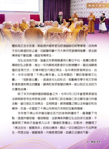%u9ad4%u8a2d%u65bd%u6b63%u9010%u6b65%u6539%u5efa%uff0c%u671f%u80fd%u63d0%u4f9b%u50e7%u773e%u66f4%u52a0%u8212%u9069%u5e7d%u975c%u7684%u4fee%u5b78%u74b0%u5883%uff0c%u6210%u70ba%u4f5b%u5b50%u5b89%u5fc3%u8fa6%u9053%u7684%u4f9d%u6b62%u8655%u3002%u4e5f%u8aa0%u646f%u547c%u7c72%u5341%u65b9%u5927%u773e%u5171%u540c%u5ba3%u50b3%u8207%u63a8%u5ee3%uff0c%u4f7f%u6cd5%u8108%u50b3%u627f%u80fd%u4e0d%u65b7%u5ef6%u7e8c%uff0c%u9952%u76ca%u6709%u60c5%u773e%u751f%u3002%u3000%u3000%u5728%u5f18%u6cd5%u6d41%u4f48%u65b9%u9762%uff0c%u5354%u6703%u8fd1%u5e74%u66f4%u7a4d%u6975%u904b%u7528AI%u6578%u4f4d%u5e73%u53f0%uff0c%u63a8%u5ee3%u767d%u96f2%u8001%u79aa%u5e2b%u7684%u5f18%u6cd5%u5f71%u97f3%uff0c%u63a8%u51fa%u4e00%u7cfb%u5217%u89e3%u60d1%u77ed%u5f71%u97f3%u65bc%u793e%u7fa4%u5a92%u9ad4%u4e2d%uff0c%u85c9%u7531%u6dfa%u986f%u6613%u61c2%u7684%u5448%u73fe%u65b9%u5f0f%uff0c%u5f15%u5c0e%u5e74%u8f15%u4e16%u4ee3%u89aa%u8fd1%u4f5b%u6cd5%uff0c%u5f9e%u4e2d%u5f97%u5230%u555f%u767c%u8207%u5b89%u5fc3%u3002%u6b64%u5916%uff0c%u4eca%u5e74%u4e5f%u8fa6%u7406%u300c%u5343%u4f5b%u5c71%u9752%u5e74%u71df%u300d%u4ee5%u53ca%u76f8%u95dc%u7684%u300c%u79aa%u7684%u667a%u6167%u5fb5%u6587%u6bd4%u8cfd%u300d%u3001%u300c%u77ed%u5f71%u97f3%u6bd4%u8cfd%u300d%uff0c%u900f%u904e%u591a%u5143%u5316%u7684%u5f62%u5f0f%uff0c%u9f13%u52f5%u9752%u5e74%u5b78%u5b50%u7528%u6587%u5b57%u8207%u5f71%u50cf%u8868%u9054%u5c0d%u4f5b%u6cd5%u7684%u9ad4%u6703%uff0c%u8b93%u4f5b%u9640%u6148%u60b2%u667a%u6167%u7684%u7cbe%u795e%uff0c%u80fd%u4ee5%u8cbc%u8fd1%u751f%u6d3b%u7684%u65b9%u5f0f%u5ee3%u70ba%u6d41%u50b3%u3002%u3000%u3000%u9664%u4e86%u672c%u6b21%u4f9b%u50e7%u8207%u50e7%u4f3d%u806f%u8abc%u6703%u4e4b%u5916%uff0c%u4eca%u5e749%u670812%u65e5%u672c%u6703%u7406%u4e8b%u9577%u667a%u65ed%u6cd5%u5e2b%u8207%u822c%u82e5%u5bfa%u4f4f%u6301%u82e5%u60df%u6cd5%u5e2b%uff0c%u4e5f%u7387%u540c%u4ec1%u524d%u5f80%u9ad8%u96c4%u4ec1%u6b66%u53e4%u56b4%u5bfa%u9032%u884c%u4f9b%u50e7%u6d3b%u52d5%u3002%u7576%u65e5%u5f7c%u6b64%u4ea4%u6d41%u4f5b%u6cd5%u3001%u4e92%u76f8%u554f%u9053%uff0c%u5c55%u73fe%u50e7%u5718%u4e4b%u9593%u4ee5%u6cd5%u76f8%u6703%u7684%u548c%u5408%u7cbe%u795e%uff0c%u4ea6%u9032%u4e00%u6b65%u978f%u56fa%u4e86%u5343%u4f5b%u5c71%u7cfb%u8207%u5730%u65b9%u5bfa%u9662%u7684%u4e92%u52d5%u8207%u5584%u7de3%u3002%u3000%u3000%u672c%u5e74%u5ea6%u5343%u4f5b%u5c71%u7cfb%u4f9b%u50e7%u6d3b%u52d5%u5728%u5404%u65b9%u7684%u53c3%u8207%u8207%u8b77%u6301%u4e0b%uff0c%u5713%u6eff%u5283%u4e0b%u53e5%u9ede%u3002%u900f%u904e%u4f9b%u50e7%u57f9%u798f%u3001%u50e7%u4f3d%u806f%u8abc%u3001%u6cd5%u8108%u50b3%u627f%u8207%u6578%u4f4d%u5f18%u6cd5%u7684%u591a%u5143%u63a8%u5c55%uff0c%u4e0d%u50c5%u5c55%u73fe%u4e86%u4f5b%u5f1f%u5b50%u5354%u6703%u9577%u4e45%u4ee5%u4f86%u300c%u8b77%u50e7%u5373%u662f%u8b77%u6cd5%u300d%u7684%u5805%u6301%uff0c%u66f4%u9ad4%u73fe%u4e86%u300c%u4f5b%u6cd5%u4f4f%u4e16%uff0c%u50e7%u5bf6%u70ba%u672c%u300d%u7684%u6838%u5fc3%u7cbe%u795e%u3002%u9858%u6b64%u4e00%u5207%u529f%u5fb7%u56de%u5411%u5341%u65b9%u6cd5%u754c%u773e%u751f%uff0c%u540c%u9711%u6cd5%u76ca%uff0c%u798f%u6167%u589e%u9577%uff0c%u5171%u690d%u83e9%u63d0%u56e0%u7de3%uff0c%u5ef6%u7e8c%u6b63%u6cd5%u6167%u547d%u4e0d%u65b7%u30029|%u4f5b%u5f1f%u5b50%u5712%u5730