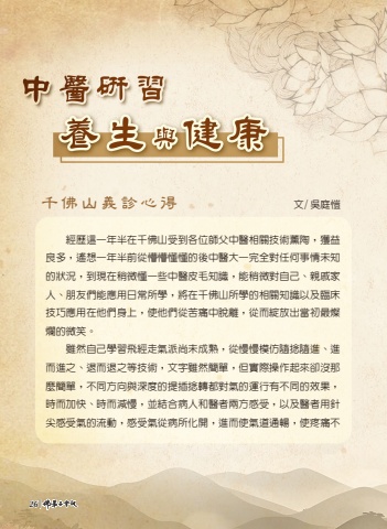 %u3000%u3000%u7d93%u6b77%u9019%u4e00%u5e74%u534a%u5728%u5343%u4f5b%u5c71%u53d7%u5230%u5404%u4f4d%u5e2b%u7236%u4e2d%u91ab%u76f8%u95dc%u6280%u8853%u85b0%u9676%uff0c%u7372%u76ca%u826f%u591a%uff0c%u9059%u60f3%u4e00%u5e74%u534a%u524d%u5f9e%u61f5%u61f5%u61c2%u61c2%u7684%u5f8c%u4e2d%u91ab%u5927%u4e00%u5b8c%u5168%u5c0d%u4efb%u4f55%u4e8b%u60c5%u672a%u77e5%u7684%u72c0%u6cc1%uff0c%u5230%u73fe%u5728%u7a0d%u5fae%u61c2%u4e00%u4e9b%u4e2d%u91ab%u76ae%u6bdb%u77e5%u8b58%uff0c%u80fd%u7a0d%u5fae%u5c0d%u81ea%u5df1%u3001%u89aa%u621a%u5bb6%u4eba%u3001%u670b%u53cb%u5011%u80fd%u61c9%u7528%u65e5%u5e38%u6240%u5b78%uff0c%u5c07%u5728%u5343%u4f5b%u5c71%u6240%u5b78%u7684%u76f8%u95dc%u77e5%u8b58%u4ee5%u53ca%u81e8%u5e8a%u6280%u5de7%u61c9%u7528%u5728%u4ed6%u5011%u8eab%u4e0a%uff0c%u4f7f%u4ed6%u5011%u5f9e%u82e6%u75db%u4e2d%u812b%u96e2%uff0c%u5f9e%u800c%u7dbb%u653e%u51fa%u7576%u521d%u6700%u71e6%u721b%u7684%u5fae%u7b11%u3002%u3000%u3000%u96d6%u7136%u81ea%u5df1%u5b78%u7fd2%u98db%u7d93%u8d70%u6c23%u6d3e%u5c1a%u672a%u6210%u719f%uff0c%u5f9e%u6162%u6162%u6a21%u4eff%u96a8%u637b%u96a8%u9032%u3001%u9032%u800c%u9032%u4e4b%u3001%u9000%u800c%u9000%u4e4b%u7b49%u6280%u8853%uff0c%u6587%u5b57%u96d6%u7136%u7c21%u55ae%uff0c%u4f46%u5be6%u969b%u64cd%u4f5c%u8d77%u4f86%u537b%u6c92%u90a3%u9ebc%u7c21%u55ae%uff0c%u4e0d%u540c%u65b9%u5411%u8207%u6df1%u5ea6%u7684%u63d0%u63d2%u637b%u8f49%u90fd%u5c0d%u6c23%u7684%u904b%u884c%u6709%u4e0d%u540c%u7684%u6548%u679c%uff0c%u6642%u800c%u52a0%u5feb%u3001%u6642%u800c%u6e1b%u6162%uff0c%u4e26%u7d50%u5408%u75c5%u4eba%u548c%u91ab%u8005%u5169%u65b9%u611f%u53d7%uff0c%u4ee5%u53ca%u91ab%u8005%u7528%u91dd%u5c16%u611f%u53d7%u6c23%u7684%u6d41%u52d5%uff0c%u611f%u53d7%u6c23%u5f9e%u75c5%u6240%u5316%u958b%uff0c%u9032%u800c%u4f7f%u6c23%u9053%u901a%u66a2%uff0c%u4f7f%u75bc%u75db%u4e0d%u5343%u4f5b%u5c71%u7fa9%u8a3a%u5fc3%u5f97%u3000%u3000%u3000%u3000%u3000%u3000%u3000%u3000%u3000%u3000%u3000%u6587/%u5433%u5ead%u613726|