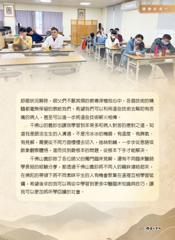 %u8212%u670d%u72c0%u6cc1%u89e3%u9664%uff0c%u5e2b%u7236%u5011%u4e0d%u53ad%u5176%u7169%u7684%u6559%u5c0e%u6df1%u690d%u6211%u5fc3%u4e2d%uff0c%u5404%u500b%u6280%u8853%u7684%u7cbe%u9ad3%u90fd%u6beb%u7121%u4fdd%u7559%u7684%u6559%u7d66%u6211%u5011%uff0c%u5e0c%u671b%u6211%u5011%u53ef%u4ee5%u5229%u7528%u9019%u4e9b%u6280%u8853%u53bb%u5e6b%u52a9%u6709%u82e6%u75db%u7684%u75c5%u4eba%uff0c%u751a%u81f3%u53ef%u4ee5%u9032%u4e00%u6b65%u5c07%u9019%u4e9b%u6280%u8853%u85aa%u706b%u76f8%u50b3%u3002%u3000%u3000%u5343%u4f5b%u5c71%u7684%u7fa9%u8a3a%u4e5f%u8b93%u6211%u5b78%u7fd2%u5230%u975e%u5e38%u591a%u548c%u75c5%u4eba%u5c0d%u7b54%u7684%u61c9%u5c0d%u4e4b%u9053%uff0c%u77e5%u9053%u6211%u662f%u8ddf%u6d3b%u751f%u751f%u7684%u4eba%u6e9d%u901a%uff0c%u4e0d%u662f%u51b7%u51b0%u51b0%u7684%u6a5f%u5668%uff0c%u6709%u6eab%u5ea6%u3001%u6709%u813e%u6c23%u3001%u6709%u898b%u89e3%uff0c%u9700%u8981%u5f9e%u4e0d%u540c%u65b9%u9762%u6162%u6162%u53bb%u5207%u5165%uff0c%u62bd%u7d72%u525d%u7e6d%uff0c%u4e00%u6b65%u6b65%u5f9e%u8a00%u8a9e%u6216%u8108%u8c61%u89c0%u5bdf%u9ad4%u609f%uff0c%u9032%u800c%u627e%u5230%u6700%u6839%u672c%u7684%u554f%u984c%uff0c%u5f9e%u6839%u672c%u4e0b%u624b%u624d%u80fd%u89e3%u6c7a%u3002%u3000%u3000%u5343%u4f5b%u5c71%u7fa9%u8a3a%u9664%u4e86%u5404%u4f4d%u5e2b%u7236%u7684%u7368%u9580%u81e8%u5e8a%u898b%u89e3%uff0c%u9084%u6709%u4e0d%u540c%u81e8%u5e8a%u91ab%u5e2b%u5b78%u9577%u59d0%u7684%u7d93%u9a57%u5206%u4eab%uff0c%u90fd%u900f%u904e%u5343%u4f5b%u5c71%u7fa9%u8a3a%u5c07%u4e0d%u540c%u4eba%u7684%u7f88%u7d46%u9023%u7d50%u8d77%u4f86%uff0c%u5728%u4f5b%u9640%u7684%u5e36%u9818%u4e0b%u5c07%u4e0d%u540c%u7d20%u6627%u5e73%u751f%u7684%u4eba%u6709%u6a5f%u6703%u805a%u96c6%u5728%u9019%u88e1%u4e92%u76f8%u5b78%u7fd2%u7825%u792a%uff0c%u5e0c%u671b%u5f8c%u4f86%u7684%u6211%u53ef%u4ee5%u518d%u5f9e%u4e2d%u5b78%u7fd2%u5230%u66f4%u591a%u4e2d%u91ab%u81e8%u5e8a%u77e5%u8b58%u8207%u6280%u5de7%uff0c%u8b93%u6211%u53ef%u4ee5%u66f4%u52a0%u5c07%u6240%u5b78%u56de%u994b%u65bc%u793e%u6703%u300227|%u5065%u5eb7%u65b0%u98df%u4ee3