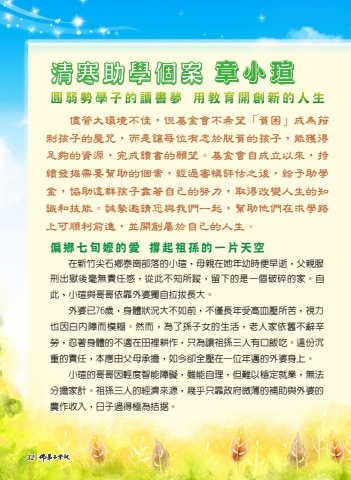 %u6e05%u5bd2%u52a9%u5b78%u500b%u6848%u7ae0%u5c0f%u7444%u7ae0%u5c0f%u7444%u7ae0%u5c0f%u7444%u504f%u9109%u4e03%u65ec%u5b24%u7684%u611b %u6490%u8d77%u7956%u5b6b%u7684%u4e00%u7247%u5929%u7a7a%u3000%u3000%u5728%u65b0%u7af9%u5c16%u77f3%u9109%u6cf0%u5d17%u90e8%u843d%u7684%u5c0f%u7444%uff0c%u6bcd%u89aa%u5728%u5979%u5e74%u5e7c%u6642%u4fbf%u65e9%u901d%uff0c%u7236%u89aa%u670d%u5211%u51fa%u7344%u5f8c%u6beb%u7121%u8cac%u4efb%u611f%uff0c%u5f9e%u6b64%u4e0d%u77e5%u6240%u8e64%uff0c%u7559%u4e0b%u7684%u662f%u4e00%u500b%u7834%u788e%u7684%u5bb6%u3002%u81ea%u6b64%uff0c%u5c0f%u7444%u8207%u54e5%u54e5%u4f9d%u9760%u5916%u5a46%u7368%u81ea%u62c9%u62d4%u9577%u5927%u3002%u3000%u3000%u5916%u5a46%u5df276%u6b72%uff0c%u8eab%u9ad4%u72c0%u6cc1%u5927%u4e0d%u5982%u524d%uff0c%u4e0d%u50c5%u9577%u5e74%u53d7%u9ad8%u8840%u58d3%u6240%u82e6%uff0c%u8996%u529b%u4e5f%u56e0%u767d%u5167%u969c%u800c%u6a21%u7cca%u3002%u7136%u800c%uff0c%u70ba%u4e86%u5b6b%u5b50%u5973%u7684%u751f%u6d3b%uff0c%u8001%u4eba%u5bb6%u4f9d%u820a%u4e0d%u8fad%u8f9b%u52de%uff0c%u5fcd%u8457%u8eab%u9ad4%u7684%u4e0d%u9069%u5728%u7530%u88e1%u8015%u4f5c%uff0c%u53ea%u70ba%u8b93%u7956%u5b6b%u4e09%u4eba%u6709%u53e3%u98ef%u5403%u3002%u9019%u4efd%u6c89%u91cd%u7684%u8cac%u4efb%uff0c%u672c%u61c9%u7531%u7236%u6bcd%u627f%u64d4%uff0c%u5982%u4eca%u537b%u5168%u58d3%u5728%u4e00%u4f4d%u5e74%u9081%u7684%u5916%u5a46%u8eab%u4e0a%u3002%u3000%u3000%u5c0f%u7444%u7684%u54e5%u54e5%u56e0%u8f15%u5ea6%u667a%u80fd%u969c%u7919%uff0c%u96d6%u80fd%u81ea%u7406%uff0c%u4f46%u96e3%u4ee5%u7a69%u5b9a%u5c31%u696d%uff0c%u7121%u6cd5%u5206%u64d4%u5bb6%u8a08%u3002%u7956%u5b6b%u4e09%u4eba%u7684%u7d93%u6fdf%u4f86%u6e90%uff0c%u5e7e%u4e4e%u53ea%u9760%u653f%u5e9c%u5fae%u8584%u7684%u88dc%u52a9%u8207%u5916%u5a46%u7684%u8fb2%u4f5c%u6536%u5165%uff0c%u65e5%u5b50%u904e%u5f97%u6975%u70ba%u62ee%u636e%u3002%u3000%u3000%u5118%u7ba1%u5927%u74b0%u5883%u4e0d%u4f73%uff0c%u4f46%u57fa%u91d1%u6703%u4e0d%u5e0c%u671b%u300c%u8ca7%u56f0%u300d%u6210%u70ba%u7b9d%u5236%u5b69%u5b50%u7684%u9b54%u5492%uff0c%u800c%u662f%u8b93%u6bcf%u4f4d%u6709%u5fd7%u65bc%u812b%u8ca7%u7684%u5b69%u5b50%uff0c%u80fd%u7372%u5f97%u8db3%u5920%u7684%u8cc7%u6e90%uff0c%u5b8c%u6210%u8b80%u66f8%u7684%u9858%u671b%u3002%u57fa%u91d1%u6703%u81ea%u6210%u7acb%u4ee5%u4f86%uff0c%u6301%u7e8c%u767c%u6398%u9700%u8981%u5e6b%u52a9%u7684%u500b%u6848%uff0c%u7d93%u904e%u5be9%u614e%u8a55%u4f30%u4e4b%u5f8c%uff0c%u7d66%u4e88%u52a9%u5b78%u91d1%uff0c%u5354%u52a9%u9019%u7fa4%u5b69%u5b50%u9760%u8457%u81ea%u5df1%u7684%u52aa%u529b%uff0c%u53d6%u5f97%u6539%u8b8a%u4eba%u751f%u7684%u77e5%u8b58%u548c%u6280%u80fd%u3002%u8aa0%u646f%u9080%u8acb%u60a8%u8207%u6211%u5011%u4e00%u8d77%uff0c%u5e6b%u52a9%u4ed6%u5011%u5728%u6c42%u5b78%u8def%u4e0a%u53ef%u9806%u5229%u524d%u9032%uff0c%u4e26%u958b%u5275%u5c6c%u65bc%u81ea%u5df1%u7684%u4eba%u751f%u300232|