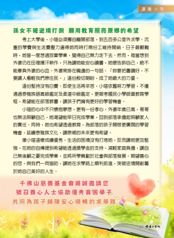 %u5343%u4f5b%u5c71%u6148%u5584%u57fa%u91d1%u6703%u7aed%u8aa0%u9080%u8acb%u60a8%u865f%u53ec%u5584%u5fc3%u4eba%u58eb%u5354%u52a9%u512a%u79c0%u8ca7%u56f0%u5b78%u5b50%u5171%u540c%u70ba%u5b69%u5b50%u92ea%u9673%u5b89%u5fc3%u9806%u66a2%u7684%u6c42%u5b78%u8def%u5b6b%u5973%u4e0d%u88ab%u9006%u5883%u6253%u5012 %u9858%u7528%u6559%u80b2%u7167%u4eae%u539f%u9109%u7684%u5e0c%u671b%u3000%u3000%u8003%u4e0a%u5927%u5b78%u5f8c%uff0c%u5c0f%u7444%u5fc5%u9808%u7368%u81ea%u96e2%u958b%u90e8%u843d%uff0c%u5230%u4e94%u767e%u591a%u516c%u91cc%u5916%u6c42%u5b78%u3002%u6c89%u91cd%u7684%u5b78%u8cbb%u8207%u751f%u6d3b%u8cbb%u58d3%u529b%u903c%u5f97%u5979%u540c%u6642%u6253%u5169%u4efd%u5de5%u7dad%u6301%u958b%u92b7%u3002%u65e5%u5b50%u6700%u8271%u96e3%u6642%uff0c%u5979%u66fe%u4e00%u5ea6%u60f3%u904e%u653e%u68c4%u5b78%u696d%uff0c%u89ba%u5f97%u81ea%u5df1%u7121%u529b%u8d70%u4e0b%u53bb%u3002%u7136%u800c%uff0c%u6bcf%u7576%u60f3%u5230%u5916%u5a46%u4ecd%u5728%u7530%u88e1%u63ee%u6c57%u8015%u4f5c%uff0c%u53ea%u70ba%u8b93%u5979%u80fd%u5b89%u5fc3%u8b80%u66f8%uff0c%u5979%u4fbf%u544a%u8a34%u81ea%u5df1%uff0c%u7d55%u4e0d%u80fd%u8f9c%u8ca0%u5916%u5a46%u7684%u5fc3%u8840%u3002%u5916%u5a46%u5e38%u639b%u5728%u5634%u908a%u7684%u4e00%u53e5%u8a71%uff1a%u300c%u59b3%u8981%u628a%u66f8%u8b80%u597d%uff0c%u4e0d%u8981%u8b93%u4eba%u770b%u8f15%u6211%u5011%u539f%u4f4f%u6c11%u3002%u300d%u9019%u4efd%u6bb7%u5207%u671f%u76fc%uff0c%u6210%u4e86%u5979%u6700%u5927%u7684%u529b%u91cf%u3002%u3000%u3000%u9019%u4efd%u5805%u6301%u6c92%u6709%u767d%u8cbb%u3002%u5373%u4f7f%u751f%u6d3b%u518d%u8f9b%u82e6%uff0c%u5c0f%u7444%u4f9d%u820a%u52aa%u529b%u5b78%u7fd2%uff0c%u4e0d%u50c5%u901a%u904e%u6cf0%u96c5%u65cf%u8a9e%u9ad8%u7d1a%u9451%u5b9a%u53ca%u67d4%u9053%u4e2d%u7d1a%u9451%u5b9a%uff0c%u66f4%u5831%u8003%u570b%u6c11%u5c0f%u5b78%u5e2b%u8cc7%u6559%u80b2%u5b78%u7a0b%uff0c%u5e0c%u671b%u80fd%u5728%u90e8%u843d%u6559%u66f8%uff0c%u8b93%u5b69%u5b50%u5011%u64c1%u6709%u66f4%u597d%u7684%u5b78%u7fd2%u6a5f%u6703%u3002%u3000%u3000%u5c0f%u7444%u7684%u5fc3%u4e2d%u4e0d%u53ea%u61f7%u62b1%u5922%u60f3%uff0c%u66f4%u6709%u4e00%u4efd%u5b5d%u5fc3%uff0c%u5916%u5a46%u5e74%u6b72%u5df2%u9ad8%uff0c%u54e5%u54e5%u4e5f%u7121%u6cd5%u7167%u9867%u81ea%u5df1%uff0c%u5979%u6e34%u671b%u80fd%u65e9%u65e5%u5b8c%u6210%u5b78%u696d%uff0c%u56de%u5230%u90e8%u843d%u627f%u64d4%u8d77%u7167%u9867%u5bb6%u4eba%u7684%u8cac%u4efb%u3002%u540c%u6642%uff0c%u5979%u4e5f%u5e0c%u671b%u900f%u904e%u6559%u80b2%uff0c%u70ba%u90e8%u843d%u7684%u5b69%u5b50%u958b%u555f%u66f4%u5ee3%u95ca%u7684%u5b78%u7fd2%u6a5f%u6703%uff0c%u5ef6%u7e8c%u6cf0%u96c5%u65cf%u6587%u5316%uff0c%u8b93%u539f%u9109%u7684%u672a%u4f86%u66f4%u6709%u5e0c%u671b%u3002%u3000%u3000%u50cf%u5c0f%u7444%u9019%u6a23%u6210%u7e3e%u512a%u79c0%uff0c%u751f%u6d3b%u7684%u56f0%u5883%u6c92%u6709%u6253%u57ae%u5979%uff0c%u53cd%u800c%u8b93%u5979%u66f4%u52a0%u5805%u5f37%uff0c%u5728%u5979%u7684%u81ea%u50b3%u63d0%u5230%u5e0c%u671b%u80fd%u900f%u904e%u734e%u5b78%u91d1%u7684%u652f%u6301%uff0c%u6e1b%u8f15%u5bb6%u5ead%u8ca0%u64d4%uff0c%u8b93%u81ea%u5df1%u7121%u5f8c%u9867%u4e4b%u6182%u5b8c%u6210%u5b78%u696d%uff0c%u4e26%u5c07%u6240%u5b78%u8ca2%u737b%u65bc%u793e%u6703%u8207%u90e8%u843d%u767c%u5c55%u3002%u671f%u671b%u5584%u5fc3%u7684%u60a8%uff0c%u8207%u6211%u5011%u4e00%u540c%u5354%u52a9%uff0c%u8b93%u5979%u5728%u6c42%u5b78%u8def%u4e0a%u9806%u5229%u524d%u9032%uff0c%u7a81%u7834%u9006%u5883%u958b%u5275%u5c6c%u65bc%u5979%u81ea%u5df1%u7f8e%u597d%u7684%u4eba%u751f%u300233|%u6eab%u6696%u4eba%u9593