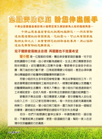 %u3000%u3000%u5343%u4f5b%u5c71%u6148%u5584%u57fa%u91d1%u6703%u5728%u6b64%u8aa0%u61c7%u5730%u9080%u8acb%u60a8%uff0c%u4e00%u540c%u4f86%u5e6b%u52a9%u9019%u4e9b%u906d%u9022%u8b8a%u6545%u7684%u8ca7%u56f0%u5bb6%u5ead%u3002%u60a8%u7684%u611b%u5fc3%uff0c%u53ef%u4ee5%u70ba%u8ca7%u56f0%u5bb6%u5ead%u9ede%u71c3%u751f%u547d%u4e4b%u706b%uff01%u672c%u6703%u6703%u5c07%u60a8%u7684%u6350%u52a9%u5584%u6b3e%u5c08%u7528%uff0c%u7528%u4ee5%u5354%u52a9%u9019%u4e9b%u6025%u9700%u5e6b%u52a9%u7684%u6025%u96e3%u5bb6%u5ead%u3002%u6025%u96e3%u6fdf%u52a9%u5bb6%u5ead%u5343%u4f5b%u5c71%u6148%u5584%u57fa%u91d1%u6703%u8a2a%u8996%u5c0f%u7d44%u5e36%u60a8%u6df1%u5165%u63a2%u8a2a%u9bae%u70ba%u4eba%u77e5%u7684%u9670%u6697%u89d2%u843d%u2026%u76fc%u60a8%u4f38%u51fa%u63f4%u624b%u76fc%u60a8%u4f38%u51fa%u63f4%u624b%u76fc%u60a8%u4f38%u51fa%u63f4%u624b%u5152%u5b50%u96d9%u819d%u53d7%u50b7%u7121%u6cd5%u81ea%u7406 %u518d%u8271%u96e3%u4e5f%u4e0d%u653e%u68c4%u5e0c%u671b%u7ba1%uff2f%u61b6%u662f%u4e00%u4f4d%u5805%u6bc5%u7684%u6bcd%u89aa%uff0c%u7368%u81ea%u627f%u53d7%u8457%u5bb6%u5ead%u7684%u91cd%u64d4%u3002%u5152%u5b50%u76ee%u524d%u5c31%u8b80%u570b%u4e2d%u4e09%u5e74%u7d1a%uff0c%u81ea%u5c0f%u88ab%u5224%u65b7%u70ba%u904e%u52d5%u5152%uff0c%u751f%u6d3b%u4e0a%u539f%u5df2%u9700%u8981%u66f4%u591a%u7684%u966a%u4f34%u8207%u95dc%u6ce8%uff0c%u537b%u5728%u9ad4%u80b2%u8ab2%u4e0a%u56e0%u610f%u5916%u53d7%u50b7%uff0c%u96d9%u819d%u9aa8%u6298%u4e26%u63a5%u53d7%u624b%u8853%u6cbb%u7642%u3002%u958b%u5200%u5f8c%u7684%u4ed6%u884c%u52d5%u4e0d%u4fbf%uff0c%u65e5%u5e38%u8d77%u5c45%u9700%u8981%u7236%u6bcd%u5354%u52a9%uff0c%u751a%u81f3%u5fc5%u9808%u7533%u8acb%u8eab%u5fc3%u969c%u7919%u8b49%u660e%u624d%u80fd%u7372%u5f97%u76f8%u95dc%u91ab%u7642%u8207%u7167%u9867%u652f%u6301%u3002%u3000%u3000%u800c%u7ba1%u5c0f%u59d0%u7684%u5148%u751f%u591a%u5e74%u524d%u56e0%u810a%u690e%u53d7%u50b7%uff0c%u7121%u6cd5%u5f9e%u4e8b%u7a69%u5b9a%u7684%u5de5%u4f5c%uff0c%u53ea%u80fd%u4f9d%u9760%u96f6%u661f%u7684%u9664%u8349%u81e8%u6642%u5de5%u7dad%u6301%u4e9b%u8a31%u6536%u5165%u3002%u5fae%u8584%u7684%u85aa%u8cc7%u96e3%u4ee5%u652f%u61c9%u9f90%u5927%u7684%u91ab%u7642%u958b%u92b7%u8207%u751f%u6d3b%u8cbb%u7528%uff0c%u5e38%u5e38%u5165%u4e0d%u6577%u51fa%u3002%u7ba1%u5c0f%u59d0%u4e5f%u53ea%u80fd%u900f%u904e%u5bb6%u5ead%u4ee3%u5de5%u4f86%u88dc%u8cbc%u5bb6%u8a08%uff0c%u4f46%u6536%u5165%u6709%u9650%uff0c%u6839%u672c%u7121%u6cd5%u652f%u6490%u773c%u524d%u6c89%u91cd%u7684%u7d93%u6fdf%u58d3%u529b%u3002%u3000%u3000%u773c%u770b%u5b69%u5b50%u7121%u6cd5%u81ea%u7406%uff0c%u6bcf%u65e5%u9700%u8981%u5bb6%u4eba%u7167%u9867%uff0c%u5bb6%u4e2d%u66f4%u96e3%u6709%u4eba%u5b89%u5fc3%u5168%u5fc3%u6295%u5165%u5de5%u4f5c%u3002%u4e09%u53e3%u4e4b%u5bb6%u5728%u56f0%u5883%u4e2d%u6399%u624e%uff0c%u6bcf%u4e00%u5929%u7684%u751f%u6d3b%u90fd%u5145%u6eff%u8457%u6311%u6230%u8207%u7121%u529b%u3002%u5373%u4fbf%u5982%u6b64%uff0c%u7ba1%u5c0f%u59d0%u4ecd%u52aa%u529b%u5805%u6301%uff0c%u76e1%u529b%u70ba%u5b69%u5b50%u5275%u9020%u4e00%u500b%u7a69%u5b9a%u7684%u74b0%u5883%uff0c%u8b93%u4ed6%u80fd%u5728%u75c5%u75db%u8207%u5b78%u7fd2%u7684%u904e%u7a0b%u4e2d%u4e0d%u81f3%u65bc%u5931%u53bb%u5e0c%u671b%u3002%u3000%u3000%u5982%u4eca%uff0c%u4ed6%u5011%u53ea%u80fd%u61c7%u8acb%u793e%u6703%u4f38%u51fa%u63f4%u624b%uff0c%u7533%u8acb%u6025%u96e3%u6551%u52a9%u3002%u9019%u4efd%u5354%u52a9%uff0c%u4e0d%u50c5%u662f%u7d93%u6fdf%u4e0a%u7684%u7de9%u89e3%uff0c%u66f4%u662f%u4e00%u80a1%u6eab%u6696%u7684%u529b%u91cf%uff0c%u5e6b%u52a9%u4e00%u5bb6%u4eba%u5728%u9006%u5883%u4e2d%u627e%u5230%u7e7c%u7e8c%u524d%u884c%u7684%u52c7%u6c23%u3002%u76fc%u60a8%u4f38%u51fa%u63f4%u624b%u76fc%u60a8%u4f38%u51fa%u63f4%u624b%u76fc%u60a8%u4f38%u51fa%u63f4%u624b34|