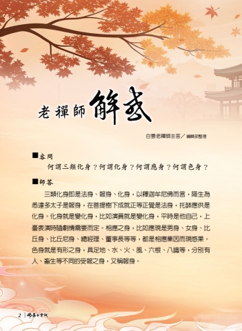 %u25a0%u5ba2%u554f%u4f55%u8b02%u4e09%u985e%u5316%u8eab%uff1f%u4f55%u8b02%u5316%u8eab%uff1f%u4f55%u8b02%u61c9%u8eab%uff1f%u4f55%u8b02%u8272%u8eab%uff1f%u25a0%u5e2b%u7b54%u3000%u3000%u4e09%u985e%u5316%u8eab%u5373%u662f%u6cd5%u8eab%u3001%u5831%u8eab%u3001%u5316%u8eab%uff0c%u4ee5%u91cb%u8fe6%u725f%u5c3c%u4f5b%u800c%u8a00%uff0c%u964d%u751f%u70ba%u6089%u9054%u591a%u592a%u5b50%u662f%u5831%u8eab%uff0c%u5728%u83e9%u63d0%u6a39%u4e0b%u6210%u5c31%u6b63%u7b49%u6b63%u89ba%u662f%u6cd5%u8eab%uff0c%u6258%u7f3d%u61c9%u4f9b%u662f%u5316%u8eab%u3002%u5316%u8eab%u5c31%u662f%u8b8a%u5316%u8eab%uff0c%u6bd4%u5982%u6f14%u54e1%u5c31%u662f%u8b8a%u5316%u8eab%uff0c%u5e73%u6642%u662f%u4ed6%u81ea%u5df1%uff0c%u4e0a%u81fa%u8868%u6f14%u6642%u96a8%u5287%u60c5%u9700%u8981%u800c%u5b9a%u3002%u76f8%u61c9%u4e4b%u8eab%uff0c%u6bd4%u5982%u61c9%u73fe%u662f%u7537%u8eab%u3001%u5973%u8eab%u3001%u6bd4%u4e18%u8eab%u3001%u6bd4%u4e18%u5c3c%u8eab%u3001%u7e3d%u7d93%u7406%u3001%u8463%u4e8b%u9577%u7b49%u7b49%uff0c%u90fd%u662f%u76f8%u61c9%u696d%u56e0%u800c%u73fe%u611f%u679c%u3002%u8272%u8eab%u5c31%u662f%u6709%u5f62%u4e4b%u8eab%uff0c%u5177%u8db3%u5730%u3001%u6c34%u3001%u706b%u3001%u98a8%u3001%u516d%u6839%u3001%u516b%u8b58%u7b49%uff0c%u5206%u5225%u6709%u4eba%u3001%u755c%u751f%u7b49%u4e0d%u540c%u7684%u53d7%u5831%u4e4b%u8eab%uff0c%u53c8%u7a31%u5831%u8eab%u3002%u767d%u96f2%u8001%u79aa%u5e2b%u4e3b%u7b54%uff0f%u7de8%u8f2f%u90e8%u6574%u74062|