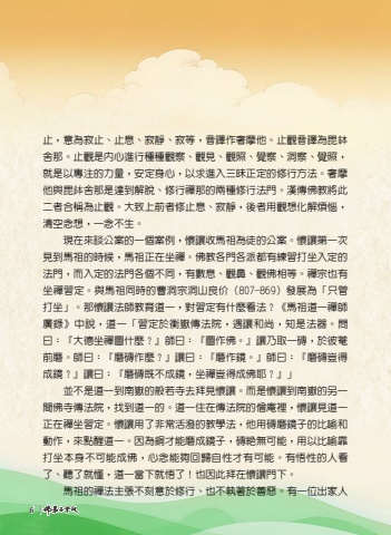 %u6b62%uff0c%u610f%u70ba%u5bc2%u6b62%u3001%u6b62%u606f%u3001%u5bc2%u975c%u3001%u5bc2%u7b49%uff0c%u97f3%u8b6f%u4f5c%u5962%u6469%u4ed6%u3002%u6b62%u89c0%u97f3%u8b6f%u70ba%u6bd8%u9262%u820d%u90a3%u3002%u6b62%u89c0%u662f%u5167%u5fc3%u9032%u884c%u7a2e%u7a2e%u89c0%u5bdf%u3001%u89c0%u898b%u3001%u89c0%u7167%u3001%u89ba%u5bdf%u3001%u6d1e%u5bdf%u3001%u89ba%u7167%uff0c%u5c31%u662f%u4ee5%u5c08%u6ce8%u7684%u529b%u91cf%uff0c%u5b89%u5b9a%u8eab%u5fc3%uff0c%u4ee5%u6c42%u9032%u5165%u4e09%u6627%u6b63%u5b9a%u7684%u4fee%u884c%u65b9%u6cd5%u3002%u5962%u6469%u4ed6%u8207%u6bd8%u9262%u820d%u90a3%u662f%u9054%u5230%u89e3%u812b%u3001%u4fee%u884c%u79aa%u90a3%u7684%u5169%u7a2e%u4fee%u884c%u6cd5%u9580%u3002%u6f22%u50b3%u4f5b%u6559%u5c07%u6b64%u4e8c%u8005%u5408%u7a31%u70ba%u6b62%u89c0%u3002%u5927%u81f4%u4e0a%u524d%u8005%u4fee%u6b62%u606f%u3001%u5bc2%u975c%uff0c%u5f8c%u8005%u7528%u89c0%u60f3%u5316%u89e3%u7169%u60f1%uff0c%u6e05%u7a7a%u5ff5%u60f3%uff0c%u4e00%u5ff5%u4e0d%u751f%u3002%u3000%u3000%u73fe%u5728%u4f86%u8ac7%u516c%u6848%u7684%u4e00%u500b%u6848%u4f8b%uff0c%u61f7%u8b93%u6536%u99ac%u7956%u70ba%u5f92%u7684%u516c%u6848%u3002%u61f7%u8b93%u7b2c%u4e00%u6b21%u898b%u5230%u99ac%u7956%u7684%u6642%u5019%uff0c%u99ac%u7956%u6b63%u5728%u5750%u79aa%u3002%u4f5b%u6559%u5404%u9580%u5404%u6d3e%u90fd%u6709%u7df4%u7fd2%u6253%u5750%u5165%u5b9a%u7684%u6cd5%u9580%uff0c%u800c%u5165%u5b9a%u7684%u6cd5%u9580%u5404%u500b%u4e0d%u540c%uff0c%u6709%u6578%u606f%u3001%u89c0%u9f3b%u3001%u89c0%u4f5b%u76f8%u7b49%u3002%u79aa%u5b97%u4e5f%u6709%u5750%u79aa%u7fd2%u5b9a%u3002%u8207%u99ac%u7956%u540c%u6642%u7684%u66f9%u6d1e%u5b97%u6d1e%u5c71%u826f%u4ef7%uff08807-869%uff09%u767c%u5c55%u70ba%u300c%u53ea%u7ba1%u6253%u5750%u300d%u3002%u90a3%u61f7%u8b93%u6cd5%u5e2b%u6559%u80b2%u9053%u4e00%uff0c%u5c0d%u7fd2%u5b9a%u6709%u4ec0%u9ebc%u770b%u6cd5%uff1f%u300a%u99ac%u7956%u9053%u4e00%u79aa%u5e2b%u5ee3%u9304%u300b%u4e2d%u8aaa%uff0c%u9053%u4e00%u300c%u7fd2%u5b9a%u65bc%u8861%u5dbd%u50b3%u6cd5%u9662%uff0c%u9047%u8b93%u548c%u5c1a%uff0c%u77e5%u662f%u6cd5%u5668%u3002%u554f%u66f0%uff1a%u300e%u5927%u5fb7%u5750%u79aa%u5716%u4ec0%u9ebc%uff1f%u300f%u5e2b%u66f0%uff1a%u300e%u5716%u4f5c%u4f5b%u3002%u300f%u8b93%u4e43%u53d6%u4e00%u78da%uff0c%u65bc%u5f7c%u83f4%u524d%u78e8%u3002%u5e2b%u66f0%uff1a%u300e%u78e8%u78da%u4f5c%u9ebc%uff1f%u300f%u8b93%u66f0%uff1a%u300e%u78e8%u4f5c%u93e1%u3002%u300f%u5e2b%u66f0%uff1a%u300e%u78e8%u78da%u8c48%u5f97%u6210%u93e1%uff1f%u300f%u8b93%u66f0%uff1a%u300e%u78e8%u78da%u65e2%u4e0d%u6210%u93e1%uff0c%u5750%u79aa%u8c48%u5f97%u6210%u4f5b%u8036%uff1f%u300f%u300d%u3000%u3000%u4e26%u4e0d%u662f%u9053%u4e00%u5230%u5357%u5dbd%u7684%u822c%u82e5%u5bfa%u53bb%u62dc%u898b%u61f7%u8b93%u3002%u800c%u662f%u61f7%u8b93%u5230%u5357%u5dbd%u7684%u53e6%u4e00%u9593%u4f5b%u5bfa%u50b3%u6cd5%u9662%uff0c%u627e%u5230%u9053%u4e00%u7684%u3002%u9053%u4e00%u4f4f%u5728%u50b3%u6cd5%u9662%u7684%u50e7%u5eb5%u88e1%uff0c%u61f7%u8b93%u898b%u9053%u4e00%u6b63%u5728%u79aa%u5750%u7fd2%u5b9a%u3002%u61f7%u8b93%u7528%u4e86%u975e%u5e38%u6d3b%u6f51%u7684%u6559%u5b78%u6cd5%uff0c%u4ed6%u7528%u78da%u78e8%u93e1%u5b50%u7684%u6bd4%u55bb%u548c%u52d5%u4f5c%uff0c%u4f86%u9ede%u9192%u9053%u4e00%u3002%u56e0%u70ba%u9285%u624d%u80fd%u78e8%u6210%u93e1%u5b50%uff0c%u78da%u7d55%u7121%u53ef%u80fd%uff0c%u7528%u4ee5%u6bd4%u55bb%u9760%u6253%u5750%u672c%u8eab%u4e0d%u53ef%u80fd%u6210%u4f5b%uff0c%u5fc3%u5ff5%u80fd%u5920%u56de%u6b78%u81ea%u6027%u624d%u6709%u53ef%u80fd%u3002%u6709%u609f%u6027%u7684%u4eba%u770b%u4e86%u3001%u807d%u4e86%u5c31%u61c2%uff0c%u9053%u4e00%u7576%u4e0b%u5c31%u609f%u4e86%uff01%u4e5f%u56e0%u6b64%u62dc%u5728%u61f7%u8b93%u9580%u4e0b%u3002%u3000%u3000%u99ac%u7956%u7684%u79aa%u6cd5%u4e3b%u5f35%u4e0d%u523b%u610f%u65bc%u4fee%u884c%u3001%u4e5f%u4e0d%u57f7%u8457%u65bc%u5584%u60e1%u3002%u6709%u4e00%u4f4d%u51fa%u5bb6%u4eba6|