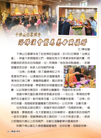 %u6587/%u9673%u6021%u6167%u3000%u3000%u5343%u4f5b%u5c71%u767d%u96f2%u79aa%u5bfa%u70ba%u4e86%u7d00%u5ff5%u4f5b%u9640%u7684%u8a95%u8fb0%uff0c%u65bc5%u67084%u65e5%u8209%u8fa6%u300c%u6d74%u4f5b%u6cd5%u6703%u300d%uff0c%u8207%u6703%u5927%u773e%u8ddf%u96a8%u5e2b%u7236%u5011%uff0c%u8654%u8aa0%u5730%u70ba%u592a%u5b50%u4f5b%u50cf%u6de8%u8eab%u7948%u798f%u4f9b%u990a%u3002%u540c%u6642%u6176%u795d%u5373%u5c07%u5230%u4f86%u7684%u6bcd%u89aa%u7bc0%uff0c%u4e5f%u4e00%u540c%u8209%u8fa6%u300c%u70ba%u6211%u6148%u6bcd%u9ede%u798f%u71c8%u300d%uff0c%u7948%u9858%u83e9%u85a9%u6148%u60b2%u52a0%u88ab%uff0c%u70ba%u773e%u4eba%u7684%u6bcd%u89aa%u5011%u7948%u798f%u3002%u3000%u3000%u300c%u6d74%u4f5b%u300d%u7684%u610f%u7fa9%uff0c%u9664%u4e86%u7dec%u61f7%u4f5b%u9640%u4e4b%u5916%uff0c%u662f%u8981%u6211%u5011%u6de8%u5fc3%uff0c%u4ee5%u8654%u8aa0%u7684%u5fc3%u7948%u6c42%u798f%u6167%u589e%u9577%uff0c%u6e05%u6de8%u81ea%u5df1%u8eab%u53e3%u610f%uff0c%u9060%u96e2%u7169%u60f1%u5875%u57a2%uff0c%u85c9%u6b64%u555f%u767c%u5167%u5fc3%u7684%u6148%u60b2%u8207%u667a%u6167%uff0c%u5b78%u7fd2%u4f5b%u9640%u5999%u660e%u5713%u89ba%u7684%u4fee%u990a%uff0c%u4ee5%u6b64%u6b8a%u52dd%u529f%u5fb7%u56de%u5411%uff0c%u7948%u9858%u773e%u751f%u96e2%u5875%u57a2%uff0c%u540c%u8b49%u5982%u4f86%u6de8%u6cd5%u8eab%u3002%u3000%u3000%u611f%u8b1d%u4e2d%u83ef%u82b1%u85dd%u7684%u8cc7%u6df1%u6559%u6388%u674e%u9e97%u6dd1%u8001%u5e2b%uff0c%u4e00%u5982%u4ee5%u5f80%uff0c%u5e36%u9818%u5979%u7684%u5b78%u54e1%u5011%u5728%u6cd5%u6703%u524d%u5915%uff0c%u5275%u4f5c%u552f%u7f8e%u82b1%u85dd%uff0c%u4ee5%u82b1%u4f9b%u4f5b%u8b77%u6301%u9053%u5834%u3002%u300c%u6d74%u4f5b%u300d%u7684%u4f9b%u82b1%u4f48%u7f6e%uff0c%u6bcf%u500b%u7d30%u7bc0%u90fd%u860a%u85cf%u8457%u5de7%u601d%u8207%u7528%u5fc3%uff0c%u4ee5%u82b1%u4f9b%u4f5b%u3001%u6cd5%u559c%u5145%u6eff%u3002%u3000%u3000%u4f4f%u6301%u82e5%u822a%u6cd5%u5e2b%u4e5f%u958b%u793a%uff0c%u795d%u798f%u6240%u6709%u7684%u6bcd%u89aa%u5011%u300c%u6bcd%u89aa%u7bc0%u5feb%u6a02%u300d%u3001%u798f%u6167%u589e%u9577%u3001%u539a%u690d%u83e9%u63d0%uff0c%u5728%u5927%u5bb6%u6b61%u5531%u751f%u65e5%u5feb%u6a02%u6b4c%u4e2d%uff0c%u9080%u8acb%u5e74%u9577%u7684%u6bcd%u89aa%u5011%u4e00%u8d77%u4f86%u5207%u86cb%u7cd5%uff0c%u611f%u8b1d%u9673%u9326%u677e%u5c45%u58eb%u8d0a%u52a9%u7684%u300c%u5c0f%u5206%u5b50%u4fdd%u6eab%u6c34%u58fa%u300d%uff0c%u822a%u5e2b%u7236%u81f4%u8d08%u7d6685%u6b72%u4ee5%u4e0a%u7684%u6bcd%u89aa%u5011%uff0c%u6d3b%u52d5%u5728%u6eab%u99a8%u6b61%u6a02%u4e2d%u5713%u6eff%u7d50%u675f%u3002%u3000%u3000%u7948%u9858%u5343%u4f5b%u5c71%u8af8%u4f4d%u5927%u5fb7%u83e9%u85a9%u798f%u6167%u589e%u9577%u3001%u5409%u7965%u5982%u610f%uff0c%u6bcd%u89aa%u7bc0%u5feb%u6a02%u30028|