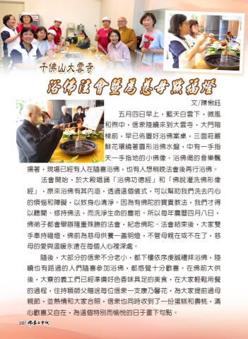 %u6587/%u9673%u6978%u923a%u3000%u3000%u4e94%u6708%u56db%u65e5%u65e9%u4e0a%uff0c%u85cd%u5929%u767d%u96f2%u4e0b%uff0c%u5fae%u98a8%u548c%u7166%u4e2d%uff0c%u4fe1%u773e%u9678%u7e8c%u4f86%u5230%u5927%u96f2%u5bfa%uff0c%u5927%u9580%u968e%u68af%u524d%uff0c%u65e9%u5df2%u4f48%u7f6e%u597d%u6d74%u4f5b%u6848%u684c%uff0c%u4e09%u9762%u838a%u56b4%u9bae%u82b1%u74b0%u7e5e%u8457%u5713%u5f62%u6d74%u4f5b%u6c34%u76e4%uff0c%u4e2d%u6709%u4e00%u624b%u6307%u5929%u4e00%u624b%u6307%u5730%u7684%u5c0f%u4f5b%u50cf%u3002%u6d74%u4f5b%u5048%u7684%u97f3%u6a02%u98c4%u63da%u8457%uff0c%u73fe%u5834%u5df2%u7d93%u6709%u4eba%u5728%u96a8%u559c%u6d74%u4f5b%uff0c%u4e5f%u6709%u4eba%u60f3%u7a0d%u665a%u6cd5%u6703%u5f8c%u518d%u884c%u6d74%u4f5b%u3002%u3000%u3000%u6cd5%u6703%u958b%u59cb%uff0c%u65bc%u5927%u6bbf%u5531%u8aa6%u300c%u6d74%u4f5b%u529f%u5fb7%u7d93%u300d%u548c%u300c%u4f5b%u8aaa%u704c%u6d17%u4f5b%u5f62%u50cf%u7d93%u300d%uff0c%u539f%u4f86%u6d74%u4f5b%u6709%u5176%u5167%u6db5%uff0c%u900f%u904e%u9019%u500b%u5100%u5f0f%uff0c%u53ef%u4ee5%u5e6b%u52a9%u6211%u5011%u6d17%u53bb%u5167%u5fc3%u7684%u7169%u60f1%u548c%u969c%u7919%uff0c%u4ee5%u81f4%u8eab%u5fc3%u6e05%u6de8%u3002%u56e0%u70ba%u6709%u4f5b%u9640%u7684%u5bf6%u8cb4%u6559%u6cd5%uff0c%u6211%u5011%u624d%u5f97%u4ee5%u807d%u805e%u3001%u4fee%u6301%u4f5b%u6cd5%uff0c%u800c%u6d17%u6de8%u751f%u547d%u7684%u5875%u57a2%u3002%u6240%u4ee5%u6bcf%u5e74%u8fb2%u66c6%u56db%u6708%u516b%u65e5%uff0c%u4f5b%u5f1f%u5b50%u90fd%u6703%u8209%u8fa6%u9686%u91cd%u6b8a%u52dd%u7684%u6cd5%u6703%uff0c%u7d00%u5ff5%u4f5b%u9640%u3002%u6cd5%u6703%u7d50%u675f%u5f8c%uff0c%u5927%u5bb6%u96d9%u624b%u5949%u6301%u798f%u71c8%uff0c%u4f5b%u524d%u70ba%u6148%u6bcd%u4f9b%u990a%u4e00%u76de%u660e%u71c8%uff0c%u4e0d%u7ba1%u6bcd%u89aa%u5728%u6216%u4e0d%u5728%u4e86%uff0c%u6148%u6bcd%u7684%u611b%u8207%u6eab%u6696%u6c38%u9060%u5728%u6bcf%u500b%u4eba%u5fc3%u88e1%u6df1%u8655%u3002%u3000%u3000%u96a8%u5f8c%uff0c%u5927%u90e8%u5206%u7684%u4fe1%u773e%u4e0d%u5206%u8001%u5c0f%uff0c%u90fd%u4e0b%u6a13%u4f9d%u5e8f%u8654%u8aa0%u79ae%u62dc%u6d74%u4f5b%uff0c%u9678%u7e8c%u4e5f%u6709%u8def%u904e%u7684%u4eba%u5011%u96a8%u559c%u53c3%u52a0%u6d74%u4f5b%uff0c%u90fd%u611f%u89ba%u5341%u5206%u6b61%u559c%u3002%u5728%u4f5b%u524d%u5927%u4f9b%u5f8c%uff0c%u5927%u5bee%u7684%u7fa9%u5de5%u5011%u5df2%u7d93%u6e96%u5099%u597d%u8272%u9999%u5473%u5177%u8db3%u7684%u7f8e%u98df%uff0c%u5728%u5927%u5bb6%u8f15%u9b06%u7528%u9910%u7684%u904e%u7a0b%uff0c%u4f4f%u6301%u7a4e%u5e2b%u7236%u8d08%u9001%u6bcf%u4f4d%u4fe1%u773e%u4e00%u652f%u5eb7%u4e43%u99a8%u82b1%uff0c%u70ba%u5927%u5bb6%u63d0%u524d%u904e%u6bcd%u89aa%u7bc0%uff0c%u4e26%u71b1%u60c5%u548c%u5927%u5bb6%u5408%u7167%uff0c%u4fe1%u773e%u4e5f%u540c%u6642%u6536%u5230%u4e86%u4e00%u4efd%u86cb%u7cd5%u548c%u58fd%u6843%uff0c%u6eff%u5fc3%u6b61%u559c%u53c8%u81ea%u5728%uff0c%u70ba%u9019%u500b%u7279%u5225%u800c%u6109%u6085%u7684%u65e5%u5b50%u756b%u4e0b%u53e5%u9ede%u300210|