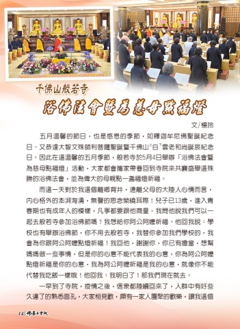 %u6587/%u694a%u73b2%u3000%u3000%u4e94%u6708%u6eab%u99a8%u7684%u7bc0%u65e5%uff0c%u4e5f%u662f%u611f%u6069%u7684%u5b63%u7bc0%uff0c%u5982%u91cb%u8fe6%u725f%u5c3c%u4f5b%u8056%u8a95%u7d00%u5ff5%u65e5%u3001%u53c8%u606d%u9022%u5927%u667a%u6587%u6b8a%u5e2b%u5229%u83e9%u85a9%u8056%u8a95%u66a8%u5343%u4f5b%u5c71%u4e0a%u767d%u4e0b%u96f2%u8001%u548c%u5c1a%u8a95%u8fb0%u7d00%u5ff5%u65e5%u3002%u56e0%u6b64%u5728%u9019%u6eab%u99a8%u7684%u4e94%u6708%u5b63%u7bc0%uff0c%u822c%u82e5%u5bfa%u65bc5%u67084%u65e5%u8209%u8fa6%u300c%u6d74%u4f5b%u6cd5%u6703%u66a8%u70ba%u6148%u6bcd%u9ede%u798f%u71c8%u300d%u6d3b%u52d5%uff0c%u5927%u5bb6%u90fd%u6703%u651c%u5bb6%u5e36%u7737%u56de%u5230%u5bfa%u9662%u4f86%u5171%u8944%u76db%u8209%u9019%u6b8a%u52dd%u7684%u6d74%u4f5b%u6cd5%u6703%uff0c%u4e26%u70ba%u5049%u5927%u7684%u6bcd%u89aa%u9ede%u4e00%u76de%u798f%u71c8%u7948%u798f%u3002%u3000%u3000%u800c%u9019%u30fc%u5929%u5c0d%u65bc%u6211%u9019%u500b%u96e2%u9109%u80cc%u4e95%uff0c%u9060%u96e2%u7236%u6bcd%u7684%u5927%u9678%u4eba%u5fc3%u60c5%u800c%u8a00%uff0c%u5167%u5fc3%u683c%u5916%u7684%u6f8e%u6e43%u6d36%u6e67%uff0c%u7121%u8072%u7684%u601d%u5ff5%u7e08%u7e5e%u8033%u969b%uff01%u5152%u5b50%u5df213%u6b72%uff0c%u9032%u5165%u9752%u6625%u671f%u4e5f%u6709%u6210%u5e74%u4eba%u7684%u6a21%u6a23%uff0c%u51e1%u4e8b%u90fd%u8981%u8ddf%u4ed6%u5546%u91cf%u3002%u6211%u554f%u4ed6%u8aaa%u6211%u5011%u53ef%u4ee5%u4e00%u8d77%u53bb%u822c%u82e5%u5bfa%u53c3%u52a0%u6d74%u4f5b%u7bc0%u55ce%uff1f%u6211%u60f3%u7d66%u4f60%u963f%u516c%u963f%u5b24%u7948%u798f%u3002%u4ed6%u56de%u6211%u8aaa%uff1a%u5b78%u6821%u4e5f%u6709%u8209%u8fa6%u6d74%u4f5b%u7bc0%uff0c%u4f60%u4e0d%u7528%u53bb%u822c%u82e5%u5bfa%uff0c%u6211%u66ff%u4f60%u53c3%u52a0%u6211%u5011%u5b78%u6821%u7684%uff0c%u6211%u6703%u70ba%u4f60%u8ddf%u963f%u516c%u963f%u5b24%u9ede%u71c8%u7948%u798f%uff01%u6211%u56de%u4ed6%uff0c%u8b1d%u8b1d%u4f60%uff0c%u4f60%u5df2%u6709%u64d4%u7576%uff0c%u60f3%u5e6b%u5abd%u5abd%u505a%u4e00%u4e9b%u4e8b%u60c5%uff0c%u4f46%u662f%u4f60%u7684%u5fc3%u610f%u4e0d%u80fd%u4ee3%u8868%u6211%u7684%u5fc3%u610f%uff0c%u4f60%u70ba%u963f%u516c%u963f%u5b24%u9ede%u71c8%u7948%u798f%u662f%u4f60%u7684%u5fc3%u610f%uff0c%u6211%u70ba%u963f%u516c%u963f%u5b24%u7948%u798f%u662f%u6211%u7684%u5fc3%u610f%uff0c%u5c31%u50cf%u4f60%u4e0d%u80fd%u4ee3%u66ff%u6211%u5403%u98ef%u4e00%u6a23%u54e6%uff01%u4ed6%u56de%u6211%uff1a%u6211%u660e%u767d%u4e86%uff01%u90a3%u6211%u5011%u73fe%u5728%u5c31%u53bb%u3002%u3000%u3000%u4e00%u65e9%u5230%u4e86%u5bfa%u9662%uff0c%u75ab%u60c5%u4e4b%u5f8c%uff0c%u4fe1%u773e%u90fd%u9678%u7e8c%u56de%u4f86%u4e86%uff0c%u4eba%u7fa4%u4e2d%u6709%u597d%u4e9b%u4e45%u9055%u4e86%u7684%u719f%u6089%u9762%u5b54%uff0c%u5927%u5bb6%u76f8%u898b%u6b61%uff0c%u9817%u6709%u4e00%u5bb6%u4eba%u5718%u805a%u7684%u6b61%u6a02%uff0c%u8b93%u6211%u9019%u500b14|