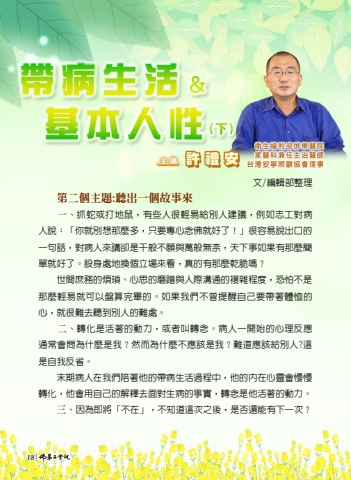 %u7b2c%u4e8c%u500b%u4e3b%u984c:%u807d%u51fa%u4e00%u500b%u6545%u4e8b%u4f86%u4e00%u3001%u6293%u86c7%u6216%u6253%u5730%u9f20%uff0c%u6709%u4e9b%u4eba%u5f88%u8f15%u6613%u7d66%u5225%u4eba%u5efa%u8b70%uff0c%u4f8b%u5982%u5fd7%u5de5%u5c0d%u75c5%u4eba%u8aaa%uff1a%u300c%u4f60%u5c31%u5225%u60f3%u90a3%u9ebc%u591a%uff0c%u53ea%u8981%u5c08%u5fc3%u5ff5%u4f5b%u5c31%u597d%u4e86%uff01%u300d%u5f88%u5bb9%u6613%u8aaa%u51fa%u53e3%u7684%u4e00%u53e5%u8a71%uff0c%u5c0d%u75c5%u4eba%u4f86%u8b1b%u537b%u662f%u5343%u822c%u4e0d%u9858%u8207%u842c%u822c%u7121%u5948%uff0c%u5929%u4e0b%u4e8b%u5982%u679c%u6709%u90a3%u9ebc%u7c21%u55ae%u5c31%u597d%u4e86%u3002%u8a2d%u8eab%u8655%u5730%u63db%u500b%u7acb%u5834%u4f86%u770b%uff0c%u771f%u7684%u6709%u90a3%u9ebc%u4e7e%u8106%u55ce%uff1f%u3000%u3000%u4e16%u9593%u5eb6%u52d9%u7684%u7169%u7463%u3001%u5fc3%u601d%u7684%u78e8%u8e6d%u8207%u4eba%u969b%u6e9d%u901a%u7684%u8907%u96dc%u7a0b%u5ea6%uff0c%u6050%u6015%u4e0d%u662f%u90a3%u9ebc%u8f15%u6613%u5c31%u53ef%u4ee5%u76e4%u7b97%u5b8c%u7562%u7684%u3002%u5982%u679c%u6211%u5011%u4e0d%u66fe%u63d0%u9192%u81ea%u5df1%u8981%u5e36%u8457%u9ad4%u6064%u7684%u5fc3%uff0c%u5c31%u5f88%u96e3%u53bb%u807d%u5230%u5225%u4eba%u7684%u96e3%u8655%u3002%u4e8c%u3001%u8f49%u5316%u662f%u6d3b%u8457%u7684%u52d5%u529b%uff0c%u6216%u8005%u53eb%u8f49%u5ff5%u3002%u75c5%u4eba%u4e00%u958b%u59cb%u7684%u5fc3%u7406%u53cd%u61c9%u901a%u5e38%u6703%u554f%u70ba%u4ec0%u9ebc%u662f%u6211%uff1f%u7136%u800c%u70ba%u4ec0%u9ebc%u4e0d%u61c9%u8a72%u662f%u6211%uff1f%u96e3%u9053%u61c9%u8a72%u7d66%u5225%u4eba?%u9019%u662f%u81ea%u6211%u53cd%u7701%u3002%u3000%u3000%u672b%u671f%u75c5%u4eba%u5728%u6211%u5011%u966a%u8457%u4ed6%u7684%u5e36%u75c5%u751f%u6d3b%u904e%u7a0b%u4e2d%uff0c%u4ed6%u7684%u5167%u5728%u5fc3%u9748%u6703%u6162%u6162%u8f49%u5316%uff0c%u4ed6%u6703%u7528%u81ea%u5df1%u7684%u89e3%u91cb%u53bb%u9762%u5c0d%u751f%u75c5%u7684%u4e8b%u5be6%uff0c%u8f49%u5ff5%u662f%u4ed6%u6d3b%u8457%u7684%u52d5%u529b%u3002%u4e09%u3001%u56e0%u70ba%u5373%u5c07%u300c%u4e0d%u5728%u300d%uff0c%u4e0d%u77e5%u9053%u9019%u6b21%u4e4b%u5f8c%uff0c%u662f%u5426%u9084%u80fd%u6709%u4e0b%u4e00%u6b21%uff1f%u6587/%u7de8%u8f2f%u90e8%u6574%u740618|