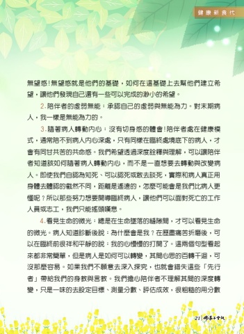 %u7121%u671b%u611f!%u7121%u671b%u611f%u5c31%u662f%u4ed6%u5011%u7684%u57fa%u790e%uff0c%u5982%u4f55%u5728%u9019%u57fa%u790e%u4e0a%u53bb%u5e6b%u4ed6%u5011%u5efa%u7acb%u5e0c%u671b%uff0c%u8b93%u4ed6%u5011%u767c%u73fe%u81ea%u5df1%u9084%u6709%u4e00%u4e9b%u53ef%u4ee5%u5b8c%u6210%u7684%u6e3a%u5c0f%u7684%u5e0c%u671b%u30022.%u966a%u4f34%u8005%u7684%u865b%u5f31%u7121%u80fd%uff1a%u627f%u8a8d%u81ea%u5df1%u7684%u865b%u5f31%u8207%u7121%u80fd%u70ba%u529b%u3002%u5c0d%u672b%u671f%u75c5%u4eba%uff0c%u6211%u4e00%u6a23%u662f%u7121%u80fd%u70ba%u529b%u7684%u30023.%u96a8%u8457%u75c5%u4eba%u8f49%u52d5%u5167%u5fc3%uff1a%u6c92%u6709%u5207%u8eab%u611f%u7684%u9ad4%u6703!%u966a%u4f34%u8005%u8655%u5728%u5065%u5eb7%u6a21%u5f0f%uff0c%u901a%u5e38%u966a%u4e0d%u5230%u75c5%u4eba%u5167%u5fc3%u6df1%u8655%uff0c%u53ea%u6709%u540c%u6a23%u5728%u81e8%u7d42%u8655%u5883%u5e95%u4e0b%u7684%u75c5%u4eba%uff0c%u624d%u6703%u6709%u540c%u7518%u5171%u82e6%u7684%u5171%u547d%u611f%u3002%u6211%u5011%u5e0c%u671b%u900f%u904e%u6df1%u5ea6%u8a6e%u91cb%u8207%u7406%u89e3%uff0c%u53ef%u4ee5%u8b93%u966a%u4f34%u8005%u77e5%u9053%u8a72%u5982%u4f55%u96a8%u8457%u75c5%u4eba%u8f49%u52d5%u5167%u5fc3%uff0c%u800c%u4e0d%u662f%u4e00%u76f4%u60f3%u8981%u53bb%u8f49%u52d5%u8207%u6539%u8b8a%u75c5%u4eba%u3002%u5373%u4f7f%u6211%u5011%u81ea%u8a8d%u70ba%u77e5%u6b7b%u3001%u53ef%u4ee5%u8a8d%u6b7b%u6216%u6562%u53bb%u8ac7%u6b7b%uff0c%u5be6%u969b%u548c%u75c5%u4eba%u771f%u6b63%u7528%u8eab%u9ad4%u53bb%u9ad4%u8a8d%u7684%u622a%u7136%u4e0d%u540c%uff0c%u8ddd%u96e2%u662f%u9059%u9060%u7684%uff0c%u600e%u9ebc%u53ef%u80fd%u6703%u662f%u6211%u5011%u6bd4%u75c5%u4eba%u66f4%u61c2%u5462%uff1f%u6240%u4ee5%u90a3%u4e9b%u52aa%u529b%u60f3%u8981%u958b%u5c0e%u81e8%u7d42%u75c5%u4eba%uff0c%u8b93%u4ed6%u5011%u53ef%u4ee5%u9762%u5c0d%u6b7b%u4ea1%u7684%u5de5%u4f5c%u4eba%u54e1%u6216%u5fd7%u5de5%uff0c%u6211%u5011%u53ea%u80fd%u6416%u982d%u5606%u606f%u30024.%u770b%u898b%u751f%u547d%u7684%u5fae%u5149%uff1a%u7e3d%u662f%u5728%u751f%u547d%u589c%u843d%u7684%u7e2b%u9699%u9593%uff0c%u624d%u53ef%u4ee5%u770b%u898b%u751f%u547d%u7684%u5fae%u5149%u3002%u75c5%u4eba%u77e5%u9053%u8a3a%u65b7%u5f8c%u8aaa%uff1a%u70ba%u4ec0%u9ebc%u6703%u662f%u6211%uff1f%u5728%u6b77%u76e1%u75db%u82e6%u6298%u78e8%u5f8c%uff0c%u53ef%u4ee5%u5728%u81e8%u7d42%u524d%u5f88%u7965%u548c%u5e73%u975c%u7684%u8aaa%uff1a%u6211%u7684%u5fc3%u6162%u6162%u7684%u6253%u958b%u4e86%u3002%u9019%u5169%u500b%u53e5%u578b%u770b%u8d77%u4f86%u90fd%u975e%u5e38%u7c21%u55ae%uff0c%u4f46%u662f%u75c5%u4eba%u662f%u5982%u4f55%u53ef%u4ee5%u8f49%u8b8a%uff0c%u5176%u9593%u5fc3%u601d%u7684%u767e%u8f49%u5343%u8ff4%uff0c%u53ef%u6c92%u90a3%u9ebc%u5bb9%u6613%u3002%u5982%u679c%u6211%u5011%u4e0d%u9858%u610f%u53bb%u6df1%u5165%u63a2%u7a76%uff0c%u4e5f%u5c31%u6703%u932f%u5931%u9019%u4e9b%u300c%u5148%u884c%u8005%u300d%u5e36%u7d66%u6211%u5011%u7684%u8eab%u6559%u8207%u8a00%u6559%u3002%u6211%u5011%u64d4%u5fc3%u966a%u4f34%u8005%u4e0d%u7406%u89e3%u5176%u9593%u7684%u6df1%u5ea6%u8f49%u8b8a%uff0c%u53ea%u662f%u4e00%u5473%u7684%u53bb%u8a2d%u5b9a%u76ee%u6a19%u3001%u6e2c%u91cf%u5206%u6578%u3001%u8a55%u4f30%u6210%u6548%uff0c%u5f88%u7c97%u7cd9%u7684%u7528%u5206%u657821|%u5065%u5eb7%u65b0%u98df%u4ee3