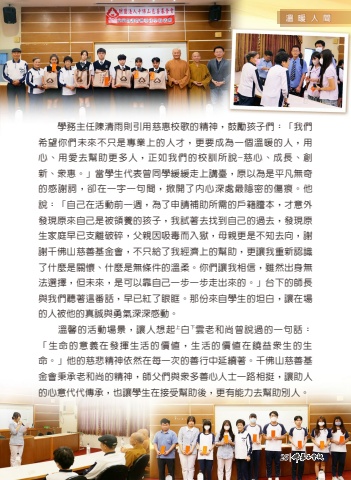 %u3000%u3000%u5b78%u52d9%u4e3b%u4efb%u9673%u6e05%u96e8%u5247%u5f15%u7528%u6148%u60e0%u6821%u6b4c%u7684%u7cbe%u795e%uff0c%u9f13%u52f5%u5b69%u5b50%u5011%uff1a%u300c%u6211%u5011%u5e0c%u671b%u4f60%u5011%u672a%u4f86%u4e0d%u53ea%u662f%u5c08%u696d%u4e0a%u7684%u4eba%u624d%uff0c%u66f4%u8981%u6210%u70ba%u4e00%u500b%u6eab%u6696%u7684%u4eba%uff0c%u7528%u5fc3%u3001%u7528%u611b%u53bb%u5e6b%u52a9%u66f4%u591a%u4eba%uff0c%u6b63%u5982%u6211%u5011%u7684%u6821%u8a13%u6240%u8aaa-%u6148%u5fc3%u3001%u6210%u9577%u3001%u5275%u65b0%u3001%u773e%u60e0%u3002%u300d%u7576%u5b78%u751f%u4ee3%u8868%u66fe%u540c%u5b78%u7de9%u7de9%u8d70%u4e0a%u8b1b%u81fa%uff0c%u539f%u4ee5%u70ba%u662f%u5e73%u51e1%u7121%u5947%u7684%u611f%u8b1d%u8a5e%uff0c%u537b%u5728%u4e00%u5b57%u4e00%u53e5%u9593%uff0c%u6380%u958b%u4e86%u5167%u5fc3%u6df1%u8655%u6700%u96b1%u5bc6%u7684%u50b7%u75d5%u3002%u4ed6%u8aaa%uff1a%u300c%u81ea%u5df1%u5728%u6d3b%u52d5%u524d%u4e00%u9031%uff0c%u70ba%u4e86%u7533%u8acb%u88dc%u52a9%u6240%u9700%u7684%u6236%u7c4d%u8b04%u672c%uff0c%u624d%u610f%u5916%u767c%u73fe%u539f%u4f86%u81ea%u5df1%u662f%u88ab%u9818%u990a%u7684%u5b69%u5b50%uff0c%u6211%u8a66%u8457%u53bb%u627e%u5230%u81ea%u5df1%u7684%u904e%u53bb%uff0c%u767c%u73fe%u539f%u751f%u5bb6%u5ead%u65e9%u5df2%u652f%u96e2%u7834%u788e%uff0c%u7236%u89aa%u56e0%u5438%u6bd2%u800c%u5165%u7344%uff0c%u6bcd%u89aa%u66f4%u662f%u4e0d%u77e5%u53bb%u5411%uff0c%u8b1d%u8b1d%u5343%u4f5b%u5c71%u6148%u5584%u57fa%u91d1%u6703%uff0c%u4e0d%u53ea%u7d66%u4e86%u6211%u7d93%u6fdf%u4e0a%u7684%u5e6b%u52a9%uff0c%u66f4%u8b93%u6211%u91cd%u65b0%u8a8d%u8b58%u4e86%u4ec0%u9ebc%u662f%u95dc%u61f7%u3001%u4ec0%u9ebc%u662f%u7121%u689d%u4ef6%u7684%u6eab%u67d4%u3002%u4f60%u5011%u8b93%u6211%u76f8%u4fe1%uff0c%u96d6%u7136%u51fa%u8eab%u7121%u6cd5%u9078%u64c7%uff0c%u4f46%u672a%u4f86%uff0c%u662f%u53ef%u4ee5%u9760%u81ea%u5df1%u4e00%u6b65%u4e00%u6b65%u8d70%u51fa%u4f86%u7684%u3002%u300d%u53f0%u4e0b%u7684%u5e2b%u9577%u8207%u6211%u5011%u807d%u8457%u9019%u756a%u8a71%uff0c%u65e9%u5df2%u7d05%u4e86%u773c%u7736%u3002%u90a3%u4efd%u4f86%u81ea%u5b78%u751f%u7684%u5766%u767d%uff0c%u8b93%u5728%u5834%u7684%u4eba%u88ab%u4ed6%u7684%u771f%u8aa0%u8207%u52c7%u6c23%u6df1%u6df1%u611f%u52d5%u3002%u3000%u3000%u3000%u3000%u6eab%u99a8%u7684%u6d3b%u52d5%u5834%u666f%uff0c%u8b93%u4eba%u60f3%u8d77%u4e0a%u767d%u4e0b%u96f2%u8001%u548c%u5c1a%u66fe%u8aaa%u904e%u7684%u4e00%u53e5%u8a71%uff1a%u300c%u751f%u547d%u7684%u610f%u7fa9%u5728%u767c%u63ee%u751f%u6d3b%u7684%u50f9%u503c%uff0c%u751f%u6d3b%u7684%u50f9%u503c%u5728%u9952%u76ca%u773e%u751f%u7684%u751f%u547d%u3002%u300d%u4ed6%u7684%u6148%u60b2%u7cbe%u795e%u4f9d%u7136%u5728%u6bcf%u4e00%u6b21%u7684%u5584%u884c%u4e2d%u5ef6%u7e8c%u8457%u3002%u5343%u4f5b%u5c71%u6148%u5584%u57fa%u91d1%u6703%u79c9%u627f%u8001%u548c%u5c1a%u7684%u7cbe%u795e%uff0c%u5e2b%u7236%u5011%u8207%u773e%u591a%u5584%u5fc3%u4eba%u58eb%u4e00%u8def%u76f8%u633a%uff0c%u8b93%u52a9%u4eba%u7684%u5fc3%u610f%u4ee3%u4ee3%u50b3%u627f%uff0c%u4e5f%u8b93%u5b78%u751f%u5728%u63a5%u53d7%u5e6b%u52a9%u5f8c%uff0c%u66f4%u6709%u80fd%u529b%u53bb%u5e6b%u52a9%u5225%u4eba%u300225|%u6eab%u6696%u4eba%u9593