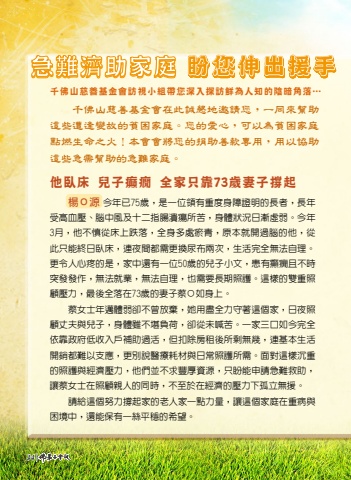 %u3000%u3000%u5343%u4f5b%u5c71%u6148%u5584%u57fa%u91d1%u6703%u5728%u6b64%u8aa0%u61c7%u5730%u9080%u8acb%u60a8%uff0c%u4e00%u540c%u4f86%u5e6b%u52a9%u9019%u4e9b%u906d%u9022%u8b8a%u6545%u7684%u8ca7%u56f0%u5bb6%u5ead%u3002%u60a8%u7684%u611b%u5fc3%uff0c%u53ef%u4ee5%u70ba%u8ca7%u56f0%u5bb6%u5ead%u9ede%u71c3%u751f%u547d%u4e4b%u706b%uff01%u672c%u6703%u6703%u5c07%u60a8%u7684%u6350%u52a9%u5584%u6b3e%u5c08%u7528%uff0c%u7528%u4ee5%u5354%u52a9%u9019%u4e9b%u6025%u9700%u5e6b%u52a9%u7684%u6025%u96e3%u5bb6%u5ead%u3002%u6025%u96e3%u6fdf%u52a9%u5bb6%u5ead%u5343%u4f5b%u5c71%u6148%u5584%u57fa%u91d1%u6703%u8a2a%u8996%u5c0f%u7d44%u5e36%u60a8%u6df1%u5165%u63a2%u8a2a%u9bae%u70ba%u4eba%u77e5%u7684%u9670%u6697%u89d2%u843d%u2026%u76fc%u60a8%u4f38%u51fa%u63f4%u624b%u76fc%u60a8%u4f38%u51fa%u63f4%u624b%u76fc%u60a8%u4f38%u51fa%u63f4%u624b%u4ed6%u81e5%u5e8a %u5152%u5b50%u7672%u7647 %u5168%u5bb6%u53ea%u976073%u6b72%u59bb%u5b50%u6490%u8d77%u694a%uff2f%u6e90%u4eca%u5e74%u5df275%u6b72%uff0c%u662f%u4e00%u4f4d%u9818%u6709%u91cd%u5ea6%u8eab%u969c%u8b49%u660e%u7684%u9577%u8005%uff0c%u9577%u5e74%u53d7%u9ad8%u8840%u58d3%u3001%u8166%u4e2d%u98a8%u53ca%u5341%u4e8c%u6307%u8178%u6f70%u760d%u6240%u82e6%uff0c%u8eab%u9ad4%u72c0%u6cc1%u65e5%u6f38%u865b%u5f31%u3002%u4eca%u5e743%u6708%uff0c%u4ed6%u4e0d%u614e%u5f9e%u5e8a%u4e0a%u8dcc%u843d%uff0c%u5168%u8eab%u591a%u8655%u7600%u9752%uff0c%u539f%u672c%u5c31%u958b%u904e%u8166%u7684%u4ed6%uff0c%u5f9e%u6b64%u53ea%u80fd%u7d42%u65e5%u81e5%u5e8a%uff0c%u9023%u591c%u9593%u90fd%u9700%u66f4%u63db%u5c3f%u5e03%u5169%u6b21%uff0c%u751f%u6d3b%u5b8c%u5168%u7121%u6cd5%u81ea%u7406%u3002%u66f4%u4ee4%u4eba%u5fc3%u75bc%u7684%u662f%uff0c%u5bb6%u4e2d%u9084%u6709%u4e00%u4f4d50%u6b72%u7684%u5152%u5b50%u5c0f%u6587%uff0c%u60a3%u6709%u7672%u7647%u4e14%u4e0d%u6642%u7a81%u767c%u767c%u4f5c%uff0c%u7121%u6cd5%u5c31%u696d%uff0c%u7121%u6cd5%u81ea%u7406%uff0c%u4e5f%u9700%u8981%u9577%u671f%u7167%u8b77%u3002%u9019%u6a23%u7684%u96d9%u91cd%u7167%u9867%u58d3%u529b%uff0c%u6700%u5f8c%u5168%u843d%u572873%u6b72%u7684%u59bb%u5b50%u8521%uff2f%u5982%u8eab%u4e0a%u3002%u3000%u3000%u8521%u5973%u58eb%u5e74%u9081%u9ad4%u5f31%u537b%u4e0d%u66fe%u653e%u68c4%uff0c%u5979%u7528%u76e1%u5168%u529b%u5b88%u8457%u9019%u500b%u5bb6%uff0c%u65e5%u591c%u7167%u9867%u4e08%u592b%u8207%u5152%u5b50%uff0c%u8eab%u9ad4%u96d6%u4e0d%u582a%u8ca0%u8377%uff0c%u537b%u5f9e%u672a%u558a%u82e6%u3002%u4e00%u5bb6%u4e09%u53e3%u5982%u4eca%u5b8c%u5168%u4f9d%u9760%u653f%u5e9c%u4f4e%u6536%u5165%u6236%u88dc%u52a9%u904e%u6d3b%uff0c%u4f46%u6263%u9664%u623f%u79df%u5f8c%u6240%u5269%u7121%u5e7e%uff0c%u9023%u57fa%u672c%u751f%u6d3b%u958b%u92b7%u90fd%u96e3%u4ee5%u652f%u61c9%uff0c%u66f4%u5225%u8aaa%u91ab%u7642%u8017%u6750%u8207%u65e5%u5e38%u7167%u8b77%u6240%u9700%u3002%u9762%u5c0d%u9019%u6a23%u6c89%u91cd%u7684%u7167%u8b77%u8207%u7d93%u6fdf%u58d3%u529b%uff0c%u4ed6%u5011%u4e26%u4e0d%u6c42%u8c50%u539a%u8cc7%u6e90%uff0c%u53ea%u76fc%u80fd%u7533%u8acb%u6025%u96e3%u6551%u52a9%uff0c%u8b93%u8521%u5973%u58eb%u5728%u7167%u9867%u89aa%u4eba%u7684%u540c%u6642%uff0c%u4e0d%u81f3%u65bc%u5728%u7d93%u6fdf%u7684%u58d3%u529b%u4e0b%u5b64%u7acb%u7121%u63f4%u3002%u3000%u3000%u8acb%u7d66%u9019%u500b%u52aa%u529b%u6490%u8d77%u5bb6%u7684%u8001%u4eba%u5bb6%u4e00%u9ede%u529b%u91cf%uff0c%u8b93%u9019%u500b%u5bb6%u5ead%u5728%u91cd%u75c5%u8207%u56f0%u5883%u4e2d%uff0c%u9084%u80fd%u4fdd%u6709%u4e00%u7d72%u5e73%u7a69%u7684%u5e0c%u671b%u3002%u76fc%u60a8%u4f38%u51fa%u63f4%u624b%u76fc%u60a8%u4f38%u51fa%u63f4%u624b%u76fc%u60a8%u4f38%u51fa%u63f4%u624b34|