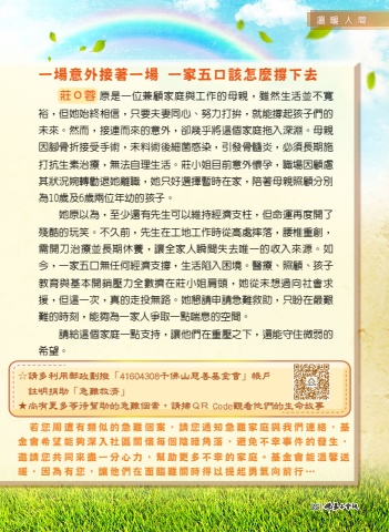 %u3000%u82e5%u60a8%u5468%u906d%u6709%u985e%u4f3c%u7684%u6025%u96e3%u500b%u6848%uff0c%u8acb%u60a8%u901a%u77e5%u6025%u96e3%u5bb6%u5ead%u8207%u6211%u5011%u9023%u7d61%uff0c%u57fa%u91d1%u6703%u5e0c%u671b%u80fd%u5920%u6df1%u5165%u793e%u5340%u95dc%u61f7%u6bcf%u500b%u9670%u6697%u89d2%u843d%uff0c%u907f%u514d%u4e0d%u5e78%u4e8b%u4ef6%u7684%u767c%u751f%uff0c%u9080%u8acb%u60a8%u5171%u540c%u4f86%u76e1%u4e00%u5206%u5fc3%u529b%uff0c%u5e6b%u52a9%u66f4%u591a%u4e0d%u5e78%u7684%u5bb6%u5ead%u3002%u57fa%u91d1%u6703%u80fd%u6eab%u99a8%u9001%u6696%uff0c%u56e0%u70ba%u6709%u60a8%uff0c%u8b93%u4ed6%u5011%u5728%u9762%u81e8%u96e3%u95dc%u6642%u5f97%u4ee5%u63d0%u8d77%u52c7%u6c23%u5411%u524d%u884c%u2026%u4e00%u5834%u610f%u5916%u63a5%u8457%u4e00%u5834 %u4e00%u5bb6%u4e94%u53e3%u8a72%u600e%u9ebc%u6490%u4e0b%u53bb%u838a%uff2f%u84c9%u539f%u662f%u4e00%u4f4d%u517c%u9867%u5bb6%u5ead%u8207%u5de5%u4f5c%u7684%u6bcd%u89aa%uff0c%u96d6%u7136%u751f%u6d3b%u4e26%u4e0d%u5bec%u88d5%uff0c%u4f46%u5979%u59cb%u7d42%u76f8%u4fe1%uff0c%u53ea%u8981%u592b%u59bb%u540c%u5fc3%u3001%u52aa%u529b%u6253%u62da%uff0c%u5c31%u80fd%u6490%u8d77%u5b69%u5b50%u5011%u7684%u672a%u4f86%u3002%u7136%u800c%uff0c%u63a5%u9023%u800c%u4f86%u7684%u610f%u5916%uff0c%u537b%u5e7e%u4e4e%u5c07%u9019%u500b%u5bb6%u5ead%u62d6%u5165%u6df1%u6df5%u3002%u6bcd%u89aa%u56e0%u8173%u9aa8%u6298%u63a5%u53d7%u624b%u8853%uff0c%u672a%u6599%u8853%u5f8c%u7d30%u83cc%u611f%u67d3%uff0c%u5f15%u767c%u9aa8%u9ad3%u708e%uff0c%u5fc5%u9808%u9577%u671f%u65bd%u6253%u6297%u751f%u7d20%u6cbb%u7642%uff0c%u7121%u6cd5%u81ea%u7406%u751f%u6d3b%u3002%u838a%u5c0f%u59d0%u76ee%u524d%u610f%u5916%u61f7%u5b55%uff0c%u8077%u5834%u56e0%u9867%u616e%u5176%u72c0%u6cc1%u5a49%u8f49%u52f8%u9000%u5979%u96e2%u8077%uff0c%u5979%u53ea%u597d%u9078%u64c7%u66ab%u6642%u5728%u5bb6%uff0c%u966a%u8457%u6bcd%u89aa%u7167%u9867%u5206%u5225%u70ba10%u6b72%u53ca6%u6b72%u5169%u4f4d%u5e74%u5e7c%u7684%u5b69%u5b50%u3002%u3000%u3000%u5979%u539f%u4ee5%u70ba%uff0c%u81f3%u5c11%u9084%u6709%u5148%u751f%u53ef%u4ee5%u7dad%u6301%u7d93%u6fdf%u652f%u67f1%uff0c%u4f46%u547d%u904b%u518d%u5ea6%u958b%u4e86%u6b98%u9177%u7684%u73a9%u7b11%u3002%u4e0d%u4e45%u524d%uff0c%u5148%u751f%u5728%u5de5%u5730%u5de5%u4f5c%u6642%u5f9e%u9ad8%u8655%u6454%u843d%uff0c%u8170%u690e%u91cd%u5275%uff0c%u9700%u958b%u5200%u6cbb%u7642%u4e26%u9577%u671f%u4f11%u990a%uff0c%u8b93%u5168%u5bb6%u4eba%u77ac%u9593%u5931%u53bb%u552f%u4e00%u7684%u6536%u5165%u4f86%u6e90%u3002%u5982%u4eca%uff0c%u4e00%u5bb6%u4e94%u53e3%u7121%u4efb%u4f55%u7d93%u6fdf%u652f%u6490%uff0c%u751f%u6d3b%u9677%u5165%u56f0%u5883%u3002%u91ab%u7642%u3001%u7167%u9867%u3001%u5b69%u5b50%u6559%u80b2%u8207%u57fa%u672c%u958b%u92b7%u58d3%u529b%u5168%u6578%u64e0%u5728%u838a%u5c0f%u59d0%u80a9%u982d%uff0c%u5979%u5f9e%u672a%u60f3%u904e%u5411%u793e%u6703%u6c42%u63f4%uff0c%u4f46%u9019%u4e00%u6b21%uff0c%u771f%u7684%u8d70%u6295%u7121%u8def%u3002%u5979%u61c7%u8acb%u7533%u8acb%u6025%u96e3%u6551%u52a9%uff0c%u53ea%u76fc%u5728%u6700%u8271%u96e3%u7684%u6642%u523b%uff0c%u80fd%u5920%u70ba%u4e00%u5bb6%u4eba%u722d%u53d6%u4e00%u9ede%u5598%u606f%u7684%u7a7a%u9593%u3002%u3000%u3000%u8acb%u7d66%u9019%u500b%u5bb6%u5ead%u4e00%u9ede%u652f%u6301%uff0c%u8b93%u4ed6%u5011%u5728%u91cd%u58d3%u4e4b%u4e0b%uff0c%u9084%u80fd%u5b88%u4f4f%u5fae%u5f31%u7684%u5e0c%u671b%u3002%u2606%u8acb%u591a%u5229%u7528%u90f5%u653f%u5283%u64a5%u300c41604308%u5343%u4f5b%u5c71%u6148%u5584%u57fa%u91d1%u6703%u300d%u5e33%u6236%u3000%u8a3b%u660e%u6350%u52a9%u300c%u6025%u96e3%u6551%u6fdf%u300d%u2605%u5c1a%u6709%u66f4%u591a%u7b49%u5f85%u5e6b%u52a9%u7684%u6025%u96e3%u500b%u6848%uff0c%u8acb%u6383%uff31%uff32 Code%u89c0%u770b%u4ed6%u5011%u7684%u751f%u547d%u6545%u4e8b35|%u6eab%u6696%u4eba%u9593