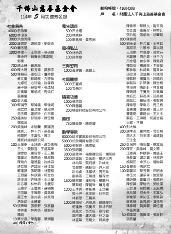 %u793e%u6703%u6148%u558410000:%u77f3%u6d69%u8ecd%u3000%u3000%u3000%u3000%u3000%u3000%u3000%u3000%u30006000:%u6797%u6f84%u6dd1%u3000%u3000%u3000%u3000%u3000%u3000%u3000%u3000%u30003000:%u6d2a%u65bd%u79c0%u9663%u3000%u3000%u3000%u3000%u3000%u3000%u3000%u30002000:%u937e%u5a1f%u5a1f%u3001%u8b1d%u6c11%u83ef%u3001%u5289%u7f8e%u71d5%u30001500:%u856d%u79c0%u901a%u3000%u3000%u3000%u3000%u3000%u3000%u3000%u3000%u30001000:%u6797%u4fca%u4e00%u3001%u738b%u6052%u7f8e%u3001%u5f35%u786f%u7db8%u3000%u8449%u91d1%u6708%u3001%u859b%u8cb4%u91d1(%u91cb%u8b49%u667a) %u3000%u90ed%u699b%u3000%u3000%u3000%u3000%u3000%u3000%u3000%u3000%u3000%u3000700:%u9673%u6b63%u6167%u3001%u937e%u60e0%u6bb7%u3000%u3000%u3000%u3000%u3000600:%u9673%u5927%u8070%u3001%u8607%u79c0%u748b%u3001%u9ec3%u5f65%u5b97%u3000500:%u91cb%u6167%u5bc2%u3001%u5f35%u677e%u7530%u3001%u76e7%u79c0%u5a1f%u3000%u8607%u6587%u6176%u3001%u8607%u9756%u5c55%u3001%u65b9%u5a77%u6021%u3000%u65b9%u5a77%u8679%u3001%u65b9%u73b2%u745c%u3001%u8a31%u5b5d%u9f4a%u3000%u8607%u5b50%u5ead%u3001%u8607%u5b89%u7433%u3001%u5f35%u6210%u767c%u3000%u8a31%u73ee%u7471%u3001%u8449%u90c1%u864e%u3001%u5468%u4fe1%u4ec1%u3000%u9ec3%u8559%u5100%u3000%u3000%u3000%u3000%u3000%u3000%u3000%u3000%u3000400:%u5f6d%u5927%u7dad%u3000%u3000%u3000%u3000%u3000%u3000%u3000%u3000%u3000300:%u8521%u9d3b%u4ea8%u3001%u8521%u9d3b%u5112%u3001%u8521%u4f73%u59ae%u3000%u8521%u5b8f%u5091%u3001%u937e%u6c76%u5cfb%u3001%u9673%u6dd1%u7406%u3000%u8303%u7389%u749f%u3001%u8b1d%u59b1%u73b2%u3001%u767d%u5b97%u5049%u3000250:%u9418%u7f8e%u73cd%u3001%u5f6d%u742c%u5a77%u3001%u9673%u4f83%u8072%u3000%u694a%u96c5%u7b51%u3000%u3000%u3000%u3000%u3000%u3000%u3000%u3000%u3000200:%u5433%u4f73%u5cf0%u3001%u5b8b%u745e%u862d%u3001%u912d%u6eff%u795d%u3000%u9673%u8c9e%u5143%u3001%u6797%u5343%u529b%u3001%u5b6b%u9577%u5bcc%u3000%u718a%u958b%u6c11%u3001%u738b%u5bcc%u5f18%u3001%u9673%u6b63%u3000%u3000%u52c7%u8cbf%u91dd%u7e54%u6709%u9650%u516c%u53f8%u3000%u3000%u3000%u3000100:%u738b%u6631%u5f3c%u3001%u738b%u8a69%u6674%u3001%u856d%u5433%u7d20%u6885%u738b%u6587%u3001%u9ec3%u975c%u5b9c%u3001%u738b%u76e7%u5bcc%u8db3%u3000%u8b1d%u96ef%u6b3d%u3001%u856d%u5bb9%u83ef%u3001%u738b%u4e09%u8ce2%u3000%u66f9%u5ee3%u6c60%u3001%u5f35%u613f%u7d14%u3001%u9673%u53d4%u821e%u3000%u9673%u745e%u5408%u3001%u8b1d%u6e58%u76c8%u3001%u8a31%u7dad%u543e%u3000%u8a31%u54f2%u6137%u3001%u8a31%u5586%u5bb8%u3001%u8521%u4f73%u6021%u3000%u8607%u747e%u598d%u3001%u5f35%u660e%u8070%u3001%u6797%u8431%u6853%u3000%u738b%u6df5%u5bcc%u3001%u6797%u6b23%u7a4e%u3001%u67ef%u91d1%u4f36%u3000%u8a31%u6df3%u6e05%u3001%u8a31%u683c%u7444%u3001%u738b%u7389%u862d%u3000%u8a31%u82af%u5ada%u3001%u6797%u6021%u541b%u3001%u4f59%u6176%u6cd3%u3000%u738b%u9806%u6c34%u3001%u738b%u8c50%u61b2%u3001%u8607%u7fce%u5a1c%u3000%u738b%u96e8%u97fb%u3001%u738b%u96c5%u9187%u3001%u9ec3%u9298%u6a1f%u3000%u9ec3%u6b63%u5b8f%u3001%u5f90%u5349%u59ff%u3001%u5f90%u65fb%u6e8e%u3000%u6d2a%u91d1%u7d21%u3001%u738b%u6167%u5bf6%u3000%u3000%u3000%u3000%u300050:%u5f35%u6649%u744b%u3001%u5f35%u5bb8%u8ed2%u3001%u5f35%u5bb8%u99a8%u3000%u6797%u79c0%u7d20%u3001%u6797%u79c0%u82f1%u3001%u9673%u90ed%u7f55%u3000%u9673%u8d8a%u3000%u3000%u3000%u3000%u3000%u3000%u3000%u3000%u3000%u300010:%u8449%u4e16%u9577%u3001%u9673%u9752%u975c%u3001%u8449%u71a0%u7bc2%u3000%u5283%u64a5%u5e33%u865f%uff1a41604308%u6236 %u540d%uff1a%u8ca1%u5718%u6cd5%u4eba%u5343%u4f5b%u5c71%u6148%u5584%u57fa%u91d1%u6703%u9673%u627f%u79be%u3001%u8521%u7167%u6587%u3001%u8b1d%u5b97%u826f%u5433%u4f73%u7487%u3001%u5f35%u5609%u73cd%u3001%u5f90%u4ea6%u5ef7%u5f35%u4f2f%u745c%u3001%u5f35%u90c1%u7433%u3001%u5f90%u8087%u5ef7800:%u9673%u4f69%u541b%u3000%u3000%u3000%u3000%u3000%u3000%u3000%u3000500:%u5289%u5e78%u59ff%u3001%u6797%u4e45%u5bcc%u3001%u738b%u79cb%u6b3d%u9ad8%u963f%u54c1%u3001%u6d2a%u6dd1%u6885%u3001%u9ec3%u797a%u665f%u738b%u6dd1%u5a1f%u3001%u65b9%u745e%u6176%u3001%u9ad8%u96ea%u82ac%u5442%u9e97%u8559%u3001%u5468%u4ea6%u9752%u3001%u6797%u5343%u529b%u5442%u5ff5%u747e%u3001%u66fe%u6c38%u5e74%u3001%u9673%u4f69%u541b%u91cb%u5982%u5b89%u3001%u91cb%u84ee%u4fee%u3001%u674e%u7f8e%u83ef%u8607%u606d%u654f%u3001%u6797%u9326%u96c0%u3001%u9f8d%u9999%u59b9%u90b1%u653f%u6def%u3001%u90b1%u70ab%u6167%u3001%u4f55%u745e%u745b%u694a%u632f%u8ed2%u3001%u694a%u5bf6%u7389%u3001%u8a31%u66c9%u6600%u674e%u5176%u6d0b%u3001%u8a31%u6db5%u96c5%u3001%u9673%u91d1%u6885%u6797%u6dd1%u8c9e%u3001%u9673%u851a%u8ed2%u3001%u6797%u767b%u798f%u9673%u7440%u5a55%u3001%u738b%u8cfd%u82f1%u3001%u8a31%u73ee%u7471%u7121%u540d%u6c0f%u3001%u8607%u9577%u5e9a%u3001%u5442%u7f8e%u5a1f%u5468%u4fe1%u4ec1%u3001%u8cf4%u6021%u7444%u3001%u5f35%u667a%u8208%u9673%u6a02%u6069%u3001%u9673%u6a02%u82af%u3001%u5468%u82b7%u674b%u9ec3%u8559%u5100%u3001%u66f9%u5ead%u7db8%u3001%u66f9%u7389%u73cd%u66f9%u5efa%u660e%u3001%u66f9%u5efa%u5b8f%u3001%u738b%u6587%u6770%u8607%u923a%u3001%u738b%u9805%u8070%u3001%u4f55%u9ec3%u91d1%u6307%u738b%u9280%u3001%u674e%u59cd%u3000%u3000%u3000%u3000%u3000%u3000400:%u5f6d%u5927%u7dad%u3000%u3000%u3000%u3000%u3000%u3000%u3000%u3000300:%u8b1d%u5b63%u71d5%u3001%u7f85%u4ef2%u7693%u3001%u5433%u500d%u6148%u5468%u5927%u6728%u3001%u8303%u7389%u749f%u3001%u66fe%u5efa%u7ff0%u738b%u751f%u5168%u3000%u3000%u3000%u3000%u3000%u3000%u3000%u3000250:%u5f6d%u742c%u5a77%u3001%u9673%u4f83%u8072%u3001%u694a%u96c5%u7b51200:%u9673%u6b63%u3001%u5433%u4f73%u5cf0%u3001%u9ec3%u6587%u73ca%u3000%u6c5f%u7dad%u771f%u3001%u6797%u7d89%u975c%u3001%u66fe%u76db%u58ec%u5b6b%u9577%u5bcc%u3001%u8b1d%u6b63%u58fd%u3001%u6797%u90c1%u5a77%u718a%u958b%u6c11%u3001%u5353%u82b8%u5fc3%u3001%u694a%u6600%u84c9150:%u9ec3%u9e97%u84c9%u3001%u9673%u70b3%u5b8f%u3000%u3000%u3000%u3000100:%u912d%u664f%u5982%u3001%u8521%u79c0%u8ce2%u3001%u6d2a%u660e%u91d1%u6797%u7389%u5973%u3001%u8b1d%u627f%u5b5d%u3001%u65bd%u6dd1%u83ef%u9673%u8a69%u8070%u3001%u66f9%u5ee3%u6c60%u3001%u5f35%u613f%u7d14%u9673%u53d4%u821e%u3001%u9673%u745e%u5408%u3001%u90ed%u6620%u91cc%u738b%u4e16%u6fa4%u3001%u8521%u5999%u9e97%u3001%u738b%u51a0%u5112%u6797%u6b23%u7a4e%u3001%u67ef%u91d1%u4f36%u3001%u738b%u5bcc%u5f18%u674e%