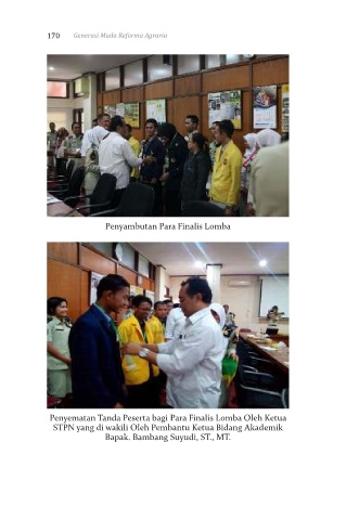 170 Generasi Muda Reforma Agraria Penyambutan Para Finalis Lomba Penyematan Tanda Peserta bagi Para Finalis Lomba Oleh Ketua STPN yang di wakili Oleh Pembantu Ketua Bidang Akademik Bapak. Bambang Suyudi, ST., MT.