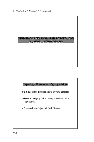 M. Shohibuddin & M. Nazir S (Penyunting) Studi kasus ini, tipologi kawasan yang diambil: > Dataran Tinggi ( Kab. Cianjur, Pemalang , dan D.I. Yogyakarta) > Dataran Rendah/pantai (Kab. Brebes) 332