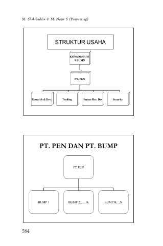 M. Shohibuddin & M. Nazir S (Penyunting) STRUKTUR USAHA KONSORSIUM KONSORSIUM 9 BUMN PT. PEN Research & Dev. Trading Human Res. Dev Security PT. PEN DAN PT. BUMP PT. PEN DAN PT. BUMP PT PEN BUMP 1 BUMP 2……K BUMP K…N 584
