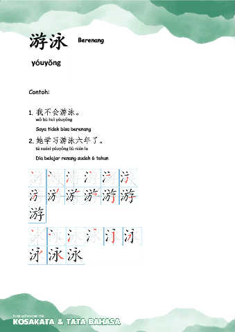 游泳 Berenang yóuyǒng Contoh: 1. 我不会游泳。 wǒ bù huì yóuyǒng Saya tidak bisa berenang 2. 她学习游泳六年了。 tā xuéxí yóuyǒng liù nián le Dia belajar renang sudah 6 tahun