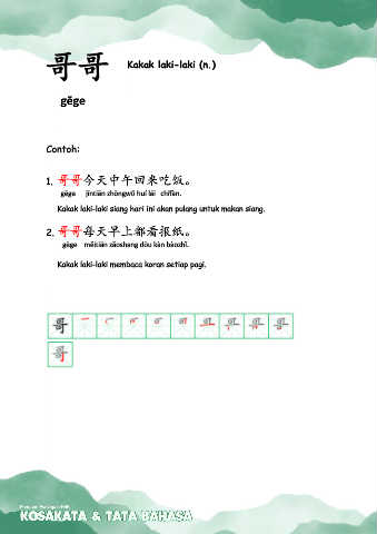 哥哥 Kakak laki-laki (n.) gēge Contoh: 1. 哥哥今天中午回来吃饭。 gēge jīntiān zhōngwǔ huí lái chīfàn. Kakak laki-laki siang hari ini akan pulang untuk makan siang. 2. 哥哥每天早上都看报纸。 gēge měitiān zǎoshang dōu kàn bàozhǐ. Kakak laki-laki membaca koran setiap pagi.