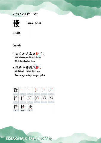 KOSAKATA “M” 慢 Lama, pelan màn Contoh: 1. 坐公共汽车太慢了。 zuò gōnggòngqìchē tài màn le. Naik bus terlalu lama. 2. 他开车开得很慢。 tā kāichē kāi de hěn màn. Dia mengemudinya sangat pelan.