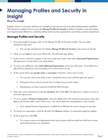 This material may contain confidential and copyrighted information of Epic Systems Corporation.Created by the Emory Digital Academy.Last Edit 7/29/25Page 1ManagingProfiles and Security in InsightHow-To GuideInsight is Emory University%u2019s platform for managing research protocols and relatedadministrative workflows.This document explains how to access the Manage Profiles & Securitymodule in Insight to view and update your departmental affiliations, includingadding and removing organizationsandsetting a primary department. Manage Profiles and Security1.From the Insight homepage, click on the Manage Profiles & Security module. The user profile management page opens.a.You can also navigate here by clicking Manage Profiles & Security in the menu on the left.2.Click on your nameto open your full profile. The full profile page displays.3.In the menu on the left, navigate to the items under your name, then select Associated Organizations. All departments currently linked to theprofiledisplay.4.To add a new affiliation, click Add Additional Organizationat the top of the page. Asearchable list of official Emory departments and units displayswith a search field at the top.5.In the search field, typespecific termsor acronymsto find the correct unitor units. a.You can also click in the field to view a dropdown menu and scroll through unit options.b.Typing the Emory school acronym first can help narrow search results.c.Departments are listed using the PeopleSoft HR hierarchy. 6.Select the correct departmentusing the checkbox, then click Add. The departmentis added to your list of associated organizations.7.To setor updatea Primary Organization, select the circlenext to the preferred department, then click Savein the bottom rightcorner of the screen. The selected department auto-populatesin other modules.a.Your original PrimaryOrganization is pulled from HRdatabut can be changed at any time. 8.To removean organization, click the Xunder the Removecolumn. A confirmation popup box displays.9.In the popup box, click OK. a.You cannot remove any departments with active projects still associatedand willneed to wait until related projects are completed.