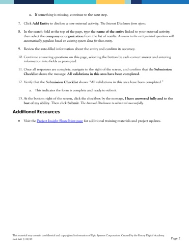 This material may contain confidential and copyrighted information of Epic Systems Corporation.Created by the Emory Digital Academy.Last Edit 7/30/25Page 2a.If something is missing, continue to the next step. 7.Click Add Entityto disclose a new external activity. The Interest Disclosure form opens.8.In the search field at the top of the page, type the name of the entitylinked to your external activity, then select the company or organizationfrom the list of results.Answers to the entity-related questions will automatically populate based on existing system data for that entity.9.Review the auto-filled information about the entity and confirm its accuracy.10.Continue answering questions on this page, selecting the button by each correct answer and entering information into fields as prompted. 11.Once all responses are complete, navigate to the rightof the screen, and confirm that the Submission Checklist shows the message, All validations in this area have been completed.12.Verify that the Submission Checklistshows: %u201cAll validations in this area have been completed.%u201d a.This indicates the form is complete and ready to submit.13.Atthe bottom right of the screen, click the checkbox by the message, I have answered fully and to the best of my ability. Then click Submit. The Annual Disclosure is submitted successfully. Additional Resources%u2022Visit the Project Insight SharePoint pagefor additional training materials and project updates.