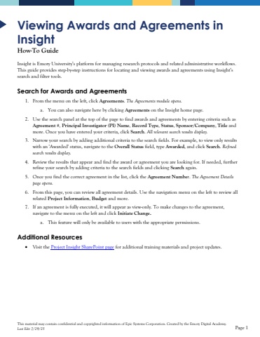 This material may contain confidential and copyrighted information of Epic Systems Corporation.Created by the Emory Digital Academy.Last Edit 7/29/25Page 1ViewingAwards and Agreements in InsightHow-To GuideInsight is Emory University%u2019s platform for managing research protocols and related administrative workflows.This guide provides step-by-step instructions for locating and viewing awards and agreements using Insight%u2019s search and filter tools.Search for Awards and Agreements1.From the menu on the left, clickAgreements.The Agreements module opens.a.You can also navigate here by clicking Agreementson the Insight home page.2.Use the search panel at the top of the page to find awards and agreements by entering criteria such as Agreement #,Principal Investigator (PI)Name, Record Type, Status, Sponsor/Company, Titleand more.Once you have entered your criteria, click Search. All relevant search results display.3.Narrowyour search by adding additional criteria to the search fields. For example, to view only results with an 'Awarded' status,navigate to the Overall Statusfield, type Awarded, and click Search.Refined search results display.4.Review the results that appear and find the award or agreement you are looking for. If needed, further refine your search by adding criteria to the search fields and clicking Searchagain. 5.Once you find the correct agreement in the list, click the Agreement Number. The Agreement Details page opens. 6.From this page, you can review all agreement details.Use the navigation menu on the leftto review all related Project Information, Budgetand more. 7.If anagreement is fully executed, it will appear as view-only. To make changesto the agreement, navigate to the menu on the left and click Initiate Change.a.This feature will only be available to users with the appropriatepermissions. Additional Resources%u2022Visit the Project Insight SharePoint pagefor additional training materials and project updates.