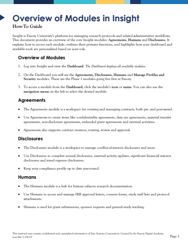 This material may contain confidential and copyrighted information of Epic Systems Corporation.Created by the Emory Digital Academy.Last Edit 7/29/25Page 1Overview of Modules inInsightHow-To GuideInsight is Emory University%u2019s platform for managing research protocols and relatedadministrative workflows.This document provides an overview of the core Insight modules: Agreements, Humansand Disclosures. It explains how to access each module, outlines their primary functions, and highlights how your dashboard and available tools are personalized based on your role. Overview of Modules1.Log into Insight and view the Dashboard. The Dashboard displays all available modules. 2.On the Dashboard you will seethe Agreements, Disclosures, Humans andManage Profiles and Security modules. These are the Phase 1 modules going live first at Emory. 3.To access a module from the Dashboard, click the module%u2019s iconor name. You can also use the navigation menuon the left to select the desired module.Agreements%u2022The Agreements module is aworkspace for creating and managing contracts, both pre-and post-award.%u2022Use Agreements to create items likeconfidentiality agreements, data use agreements, material transfer agreements, non-disclosure agreements, unfunded grant agreements and external activities. %u2022Agreements also supportscontract creation, routing, review and approval. Disclosures%u2022TheDisclosures moduleisa workspace to manage conflict-of-interest disclosures and more. %u2022Use Disclosuresto complete annual disclosures, external activity updates, significant financial interest disclosuresand travel expense disclosures.%u2022Keep your compliance profile up to date year-round. Humans%u2022The Humans module is a hub for human subjects research documentation. %u2022Use Humansto access and manage IRB approval letters, consent forms, study staff listsandprotocol attachments. %u2022Humans is usedfor grant submissions, sponsor requests and general study tracking.