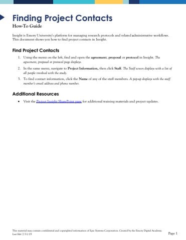 This material may contain confidential and copyrighted information of Epic Systems Corporation.Created by the Emory Digital Academy.Last Edit 7/31/25Page 1Finding Project ContactsHow-To GuideInsight is Emory University%u2019s platform for managing research protocols and relatedadministrative workflows.This documentshows you how tofind project contacts in Insight. Find Project Contacts1.Using the menu on the left, find and open the agreement, proposal or protocol in Insight.The agreement, proposal or protocol page displays.2.In the same menu, navigate toProject Information,then click Staff. The Staff screen displays with a list of all people involved with the study. 3.To find contact information, click the Nameof any of the staff members. A pop-up displays with the staff member%u2019s email address and phone number.Additional Resources%u2022Visit the Project Insight SharePoint pagefor additional training materials and project updates.