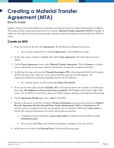 This material may contain confidential and copyrighted information of Epic Systems Corporation.Created by the Emory Digital Academy.Last Edit 7/31/25Page 1Creating a Material Transfer Agreement (MTA)How-To GuideInsight is Emory University%u2019s platform for managing research protocols and related administrative workflows.This guide provides step-by-step instructions for creating a Material Transfer Agreement (MTA)in Insight. It walks users through selecting the agreement type, entering required information and submitting the MTA for review.Create an MTA1.From the menu on the left, click Agreements. The All Agreements/Proposals screenopens.a.You can also navigate here by clicking Agreements on the Insight home page.2.In the same menu, navigate to Actions, then click Create Agreement. The Create Agreement screen displays.3.On the Create Agreement screen, select Material Transfer Agreement. Click the buttonto confirm you are submitting an agreement related to the transfer of materials or materials and data.4.Scroll down the page and enter the Principal Investigator (PI) in the designated field. Start by typing the PI%u2019s last name, then select the correct name from the dropdown list that appears.The Organization/Department field will auto-populate based on the PI%u2019s affiliation.a.For common names, use the format,Last Name, First Initial.5.In the panel on the right, view the Checklist. When all required entries are complete, text will appear that reads, All validations in this area have been completed. Click Createat the bottom right of the screen. The new MTA is created with an Agreement Number assigned, displaying on the Agreement Details page.6.On the Agreement Detailspage, enter a titlefor the MTA. 7.Return to the menu on the left, navigate to Project Information, and review the sections for RelatedRecords, Agreement Details, External Party, Intake Questionnaire, Staffand Attachments. All sections must be complete before the new agreement can be submitted. Click each section nameto provide the required information and answer all mandatory questions. a.Completed sections will display a green check mark. Incomplete sections will show a red exclamation point. b.You can also click Nextat the bottom of each page to navigate to the next section.8.In the menu on the left, click External Party. The External Party page opens.