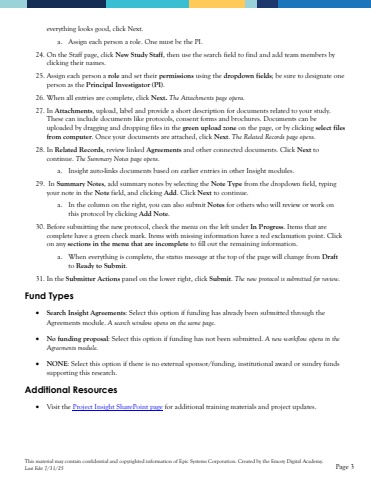 This material may contain confidential and copyrighted information of Epic Systems Corporation.Created by the Emory Digital Academy.Last Edit 7/31/25Page 3everything looks good, click Next. a.Assign each person a role. One must be the PI. 24.On the Staff page, clickNew Study Staff, then use thesearch field to find and add team members by clicking their names. 25.Assign each person a roleand set their permissionsusing the dropdown fields; be sure to designate one person as the Principal Investigator (PI).26.When all entries are complete, click Next. The Attachments page opens.27.In Attachments, upload, label and provide a short description fordocuments related to your study. These can include documentslikeprotocols, consent formsand brochures. Documents can be uploaded by dragging and dropping files in the green upload zoneon the page, or by clicking select files from computer. Once your documents are attached, click Next. The Related Records page opens. 28.In Related Records, review linked Agreementsand other connected documents. Click Nextto continue. The Summary Notes page opens.a.Insight auto-links documents based on earlier entriesin other Insight modules. 29.In Summary Notes, add summary notes by selecting the Note Typefrom the dropdown field, typing your note in the Notefield, and clicking Add. Click Nextto continue. a.In the column on the right, you can also submit Notesfor others who will review or work on this protocolby clickingAdd Note.30.Before submitting the new protocol, check the menu on the left under In Progress. Items that are complete have a green check mark. Items with missing information have a red exclamation point. Click on any sections in the menu that are incompleteto fill out the remaininginformation. a.When everything is complete, the status message at the top of the page will change from Draftto Ready to Submit.31.In the Submitter Actionspanel on the lower right, click Submit. The new protocol is submitted forreview.Fund Types%u2022Search Insight Agreements: Select this optionif funding has already been submitted through the Agreements module. A search window opens on the same page.%u2022No funding proposal: Select this option if funding has not been submitted. A new workflow opens in the Agreements module.%u2022NONE: Select this optionif there is no external sponsor/funding, institutional award or sundry funds supporting this research. Additional Resources%u2022Visit the Project Insight SharePoint pagefor additional training materials and project updates.