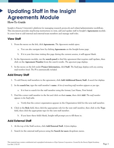 This material may contain confidential and copyrighted information of Epic Systems Corporation.Created by the Emory Digital Academy.Last Edit 7/30/25Page 1UpdatingStaff in the Insight Agreements ModuleHow-To GuideInsight is Emory University%u2019s platform for managing research protocols and relatedadministrative workflows.This document provides step-by-step instructions to view, add and updatestaff in Insight%u2019sAgreements module. It covers how toadd internal and external team membersand manage staff roles.ViewStaff1.From the menu on the left, clickAgreements. The Agreements module opens.a.You can also navigate here by clicking Agreements on the Insight home page.b.If it is your first time visiting this page during the current session, it will appear blank.2.In the Agreements module, use the search panelto find the agreement that requires staff updates, then click on the Agreement Numberfrom the search results.The agreement page displays. 3.In themenu on the leftunder Project Information, click Staff. The Staff pagedisplayswith any existing staffmembers listed. The PI is automatically includedAdd Emory Staff1.To add Emory staff members to the agreement, click Add Additional Emory Staff. A search bar displays.2.In the search bar, type the staff member%u2019sname. A list of matching staff members appears as you type.a.It is best to search for the staff member using the format, Last Name, First Initial.3.Find the correct staff memberin the listand click on theirname, then clickAdd. The staff memberappears in the Staff table.a.Verify that the correct organization appears in the Organization field for the new staff member.4.Click in the Rolefield, then click the appropriaterolefor the new staff member, then click in the Typefield, then click the appropriatetypefor the new staff member. b.If you leave these fields blank, Insight will prompt you to fill them in. Add External Staff1.At the top of the Staff section, click Add External Staff. A formdisplays. 2.Search for the external staff person using the Search for usersdropdown menu.