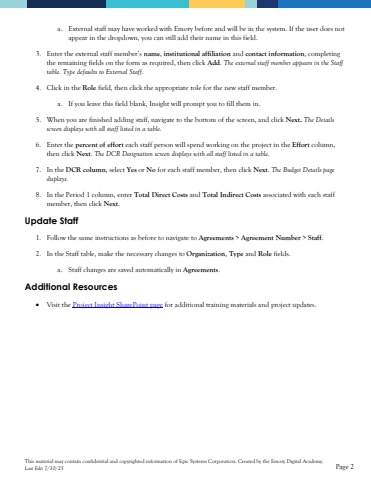 This material may contain confidential and copyrighted information of Epic Systems Corporation.Created by the Emory Digital Academy.Last Edit 7/30/25Page 2a.External staff may have worked with Emory before and will be in the system. If the user does not appear in the dropdown, you can still add their name in this field. 3.Enter the external staff member%u2019s name, institutional affiliationand contact information, completing the remaining fields on the form as required, then click Add. The external staff member appears in the Staff table. Type defaults to External Staff. 4.Click in the Rolefield, then click the appropriaterolefor the new staff member. a.If you leave this field blank, Insight will prompt you to fill them in. 5.When you are finished adding staff, navigate to thebottom of the screen, and clickNext. The Details screen displayswith all staff listed in a table.6.Enter the percent of efforteach staff person will spend working on the project inthe Effortcolumn, then click Next. The DCRDesignationscreen displays with all staff listed in a table. 7.In the DCR column, select Yesor Nofor each staff member, then click Next. The Budget Details page displays.8.In the Period 1 column, enter Total Direct Costs andTotal Indirect Costsassociated with each staff member, then click Next. Update Staff1.Follow the same instructions as before to navigate to Agreements>Agreement Number> Staff. 2.In the Staff table, make the necessary changes to Organization, Typeand Rolefields. a.Staff changes are saved automatically in Agreements. Additional Resources%u2022Visit the Project Insight SharePoint pagefor additional training materials and project updates.