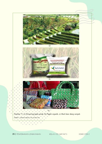 (a) (b) (c) Gambar 17. (a) Terasering pada sawah, (b) Pupuk organik, (c) Hasil daur ulang sampah Sumber : pikiran-rakyat.com, gresik.com 35 | PENCEMARAN LINGKUNGAN KELAS VII SMP/MTS SEMESTER 2