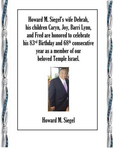 Howard M. Siegel’s wife Debrah, his children Caryn, Joy, Barri Lynn, and Fred are honored to celebrate his 83rd Birthday and 68th consecutive year as a member of our beloved Temple Israel. Howard M. Siegel