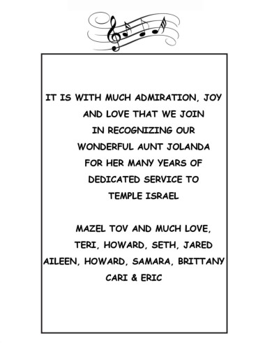 IT IS WITH MUCH ADMIRATION, JOY AND LOVE THAT WE JOIN IN RECOGNIZING OUR WONDERFUL AUNT JOLANDA FOR HER MANY YEARS OF DEDICATED SERVICE TO TEMPLE ISRAEL MAZEL TOV AND MUCH LOVE, TERI, HOWARD, SETH, JARED AILEEN, HOWARD, SAMARA, BRITTANY CARI & ERIC