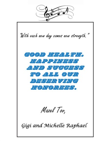 “With each new day comes new strength.” Good health, happiness and success to all our deserving Honorees. Mazel Tov, Gigi and Michelle Raphael