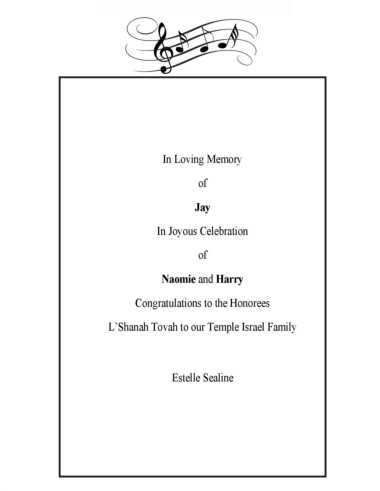 In Loving Memory of Jay In Joyous Celebration of Naomie and Harry Congratulations to the Honorees L’Shanah Tovah to our Temple Israel Family Estelle Sealine