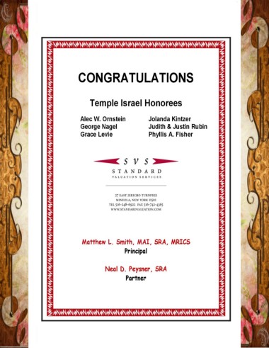 CONGRATULATIONS Temple Israel Honorees Alec W. Ornstein Jolanda Kintzer George Nagel Judith & Justin Rubin Grace Levie Phyllis A. Fisher Matthew L. Smith, MAI, SRA, MRICS Principal Neal D. Peysner, SRA Partner