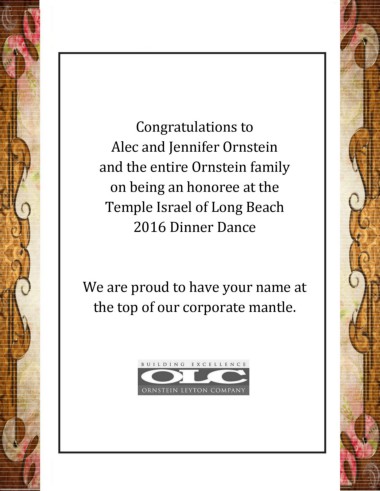 Congratulations to Alec and Jennifer Ornstein and the entire Ornstein family on being an honoree at the Temple Israel of Long Beach 2016 Dinner Dance We are proud to have your name at the top of our corporate mantle.