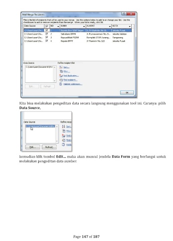 Kita bisa melakukan pengeditan data secara langsung menggunakan tool ini. Caranya: pilih Data Source, kemudian klik tombol Edit… maka akan muncul jendela Data Form yang berfungsi untuk melakukan pengeditan data sumber. Page 147 of 187