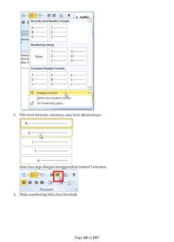 4. Plih level tertentu, misalnya satu level dibawahnya: Atau bisa juga dengan menggunakan tombol Indentasi 5. Maka numbering teks akan berubah Page 68 of 187