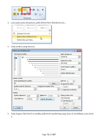 3. Lalu pada menu dropdown, pilih De ine New Multilevel List… 4. Pada jendela yang muncul, 5. Pada bagian Click level to modify, pilih level numbering yang akan di modi ikasi, yaitu level 2. Page 72 of 187