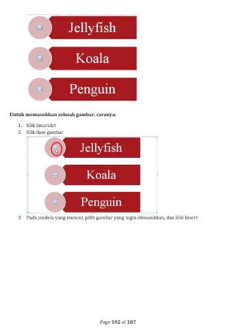 Untuk memasukkan sebuah gambar, caranya: 1. Klik SmartArt 2. Klik ikon gambar 3. Pada jendela yang muncul, pilih gambar yang ingin dimasukkan, dan klik Insert Page 102 of 187