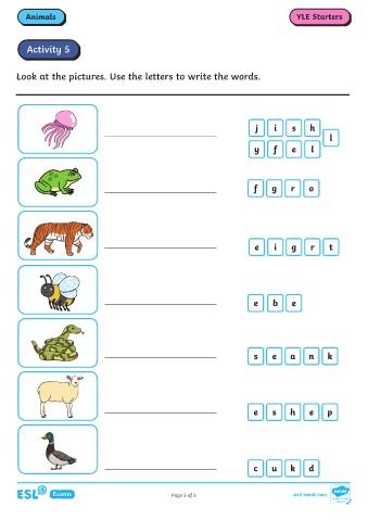 Animals YLE Starters Activity 5 Look at the pictures. Use the letters to write the words. j i s h l y f e l f g r o e i g r t e b e s e a n k e s h e p c u k d Page 5 of 5 visit twinkl.com