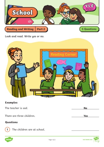 School School Starters Reading and Writing Part 2 5 Questions Look and read. Write yes or no. Examples: The teacher is sad. The teacher is sad. No There are three children. Yes Questions 1 The children are at school. Page 1 of 2 visit twinkl.com