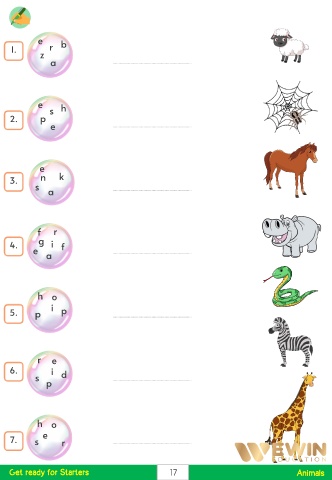 e b 1. z r a e s h 2. p e e 3. n k s a f r 4. g i f e a h o i 5. p p r e 6. i d s p h o 7. s e r Get ready for Starters 17 Animals
