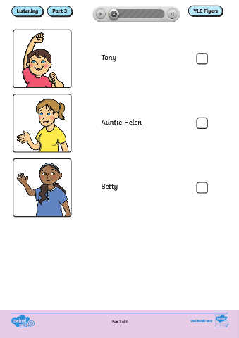 Listening Part 3 YLE Flyers Tony Auntie Helen Betty Page 2 of 3 visit twinkl.com