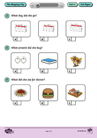 The Shopping Trip Part 4 YLE Flyers 3 What day did she go? A B C 4 What present did she buy? A B C 5 What did she eat for dinner? A B C Page 2 of 2 visit twinkl.com